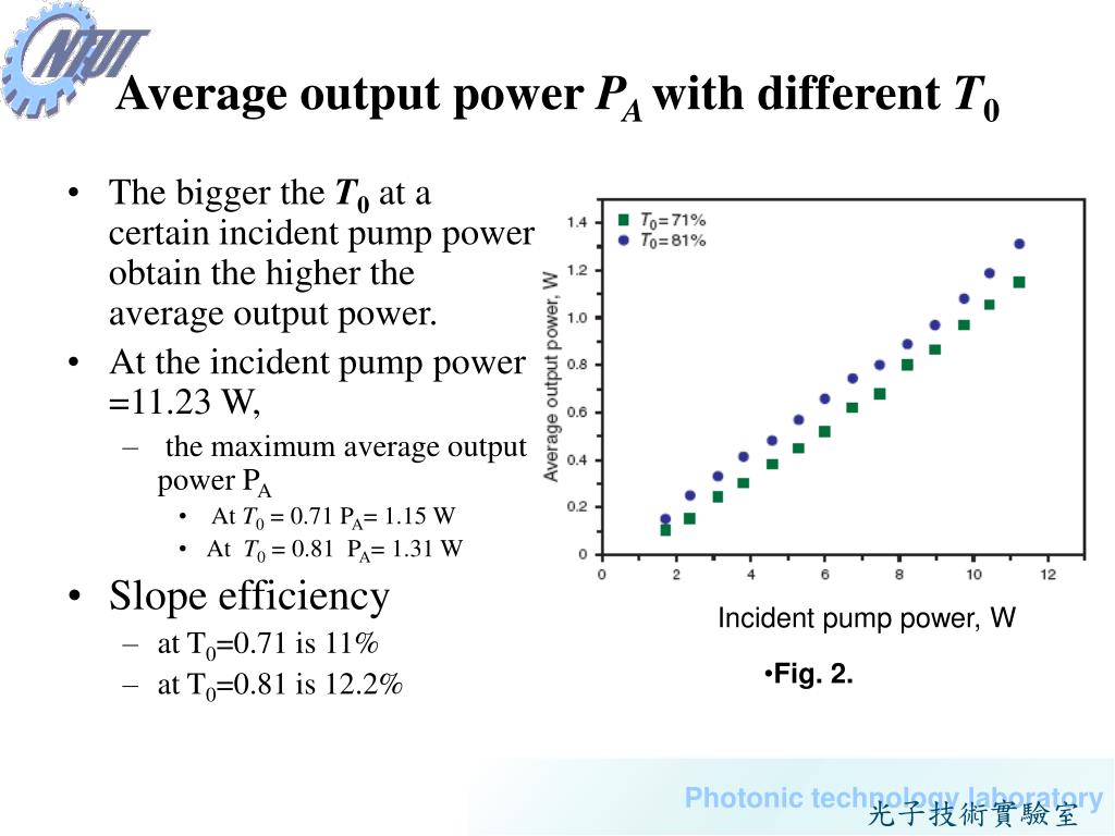 Average output power PA with different T0 The bigger the T0 at a certain incident pump power obtain the higher the average output power. At the incident pump power =11.23 W, the maximum average output power PA At T0 = 0.71 PA= 1.15 W At T0 = 0.81 PA= 1.31 W Slope efficiency at T0=0.71 is 11% at T0=0.81 is 12.2% Incident pump power, W • Fig. 2.