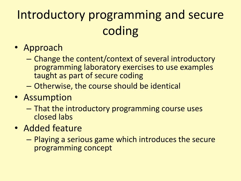 Introductory programming and secure coding • Approach • Change the content/context of several introductory programming laboratory exercises to use examples taught as part of secure coding • Otherwise, the course should be identical • Assumption • That the introductory programming course uses closed labs • Added feature • Playing a serious game which introduces the secure programming concept