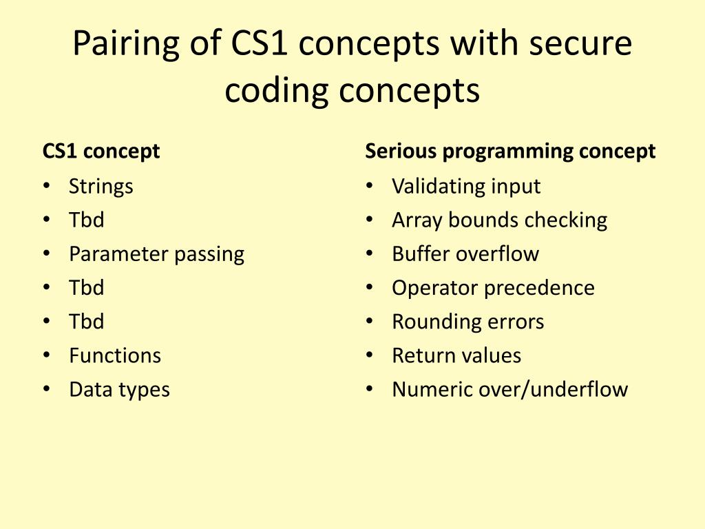 Pairing of CS1 concepts with secure coding concepts CS1 concept Serious programming concept Validating input Array bounds checking Buffer overflow Operator precedence Rounding errors Return values Numeric over/underflow • Strings • Tbd • Parameter passing • Tbd • Tbd • Functions • Data types