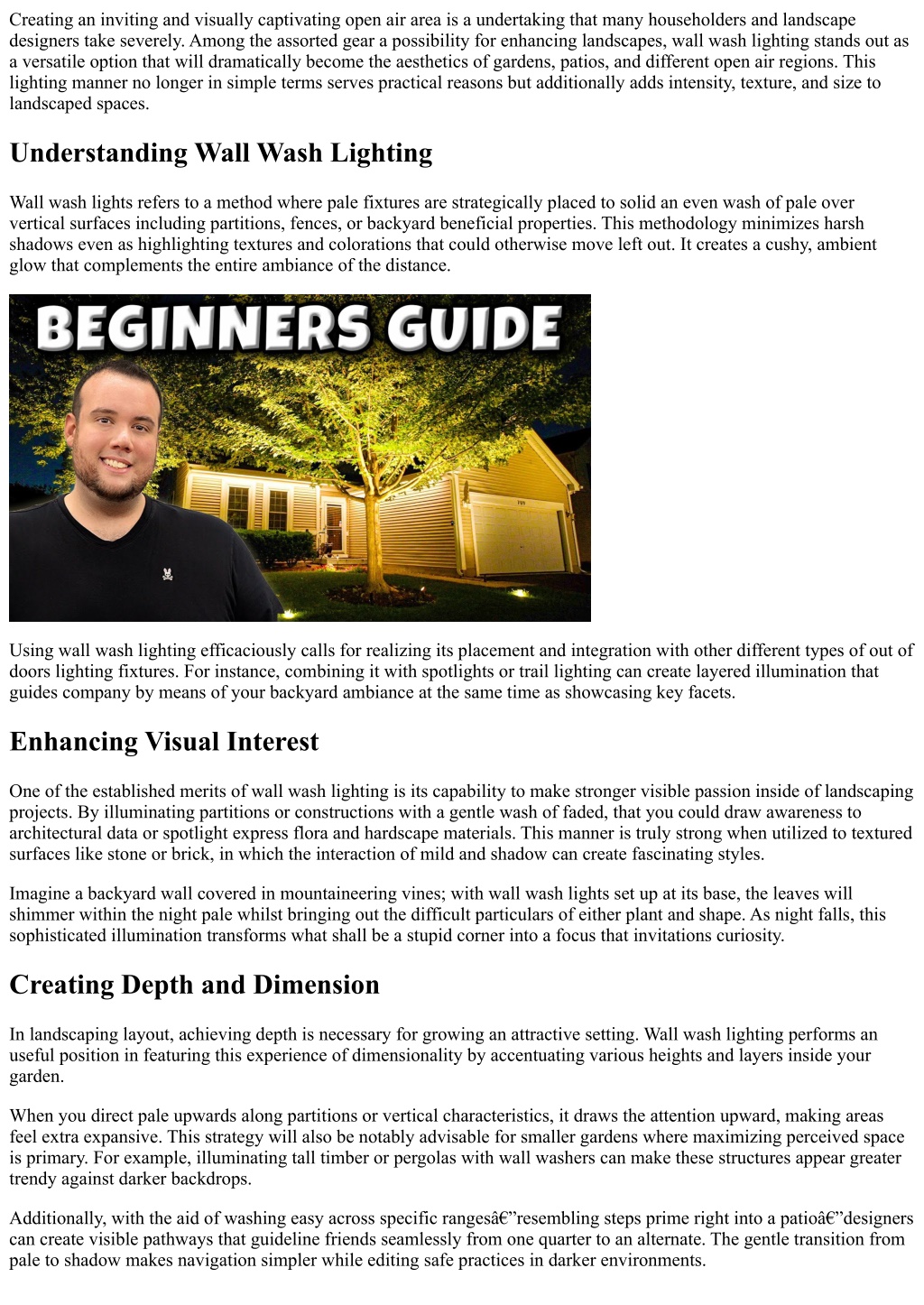 Creating an inviting and visually captivating open air area is a undertaking that many householders and landscape designers take severely. Among the assorted gear a possibility for enhancing landscapes, wall wash lighting stands out as a versatile option that will dramatically become the aesthetics of gardens, patios, and different open air regions. This lighting manner no longer in simple terms serves practical reasons but additionally adds intensity, texture, and size to landscaped spaces. Understanding Wall Wash Lighting Wall wash lights refers to a method where pale fixtures are strategically placed to solid an even wash of pale over vertical surfaces including partitions, fences, or backyard beneficial properties. This methodology minimizes harsh shadows even as highlighting textures and colorations that could otherwise move left out. It creates a cushy, ambient glow that complements the entire ambiance of the distance. Using wall wash lighting efficaciously calls for realizing its placement and integration with other different types of out of doors lighting fixtures. For instance, combining it with spotlights or trail lighting can create layered illumination that guides company by means of your backyard ambiance at the same time as showcasing key facets. Enhancing Visual Interest One of the established merits of wall wash lighting is its capability to make stronger visible passion inside of landscaping projects. By illuminating partitions or constructions with a gentle wash of faded, that you could draw awareness to architectural data or spotlight express flora and hardscape materials. This manner is truly strong when utilized to textured surfaces like stone or brick, in which the interaction of mild and shadow can create fascinating styles. Imagine a backyard wall covered in mountaineering vines; with wall wash lights set up at its base, the leaves will shimmer within the night pale whilst bringing out the difficult particulars of either plant and shape. As night falls, this sophisticated illumination transforms what shall be a stupid corner into a focus that invitations curiosity. Creating Depth and Dimension In landscaping layout, achieving depth is necessary for growing an attractive setting. Wall wash lighting performs an useful position in featuring this experience of dimensionality by accentuating various heights and layers inside your garden. When you direct pale upwards along partitions or vertical characteristics, it draws the attention upward, making areas feel extra expansive. This strategy will also be notably advisable for smaller gardens where maximizing perceived space is primary. For example, illuminating tall timber or pergolas with wall washers can make these structures appear greater trendy against darker backdrops. Additionally, with the aid of washing easy across specific ranges—resembling steps prime right into a patio—designers can create visible pathways that guideline friends seamlessly from one quarter to an alternate. The gentle transition from pale to shadow makes navigation simpler while editing safe practices in darker environments.