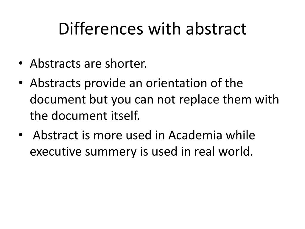 Differences with abstract • Abstracts are shorter. • Abstracts provide an orientation of the document but you can not replace them with the document itself. • Abstract is more used in Academia while executive summery is used in real world.