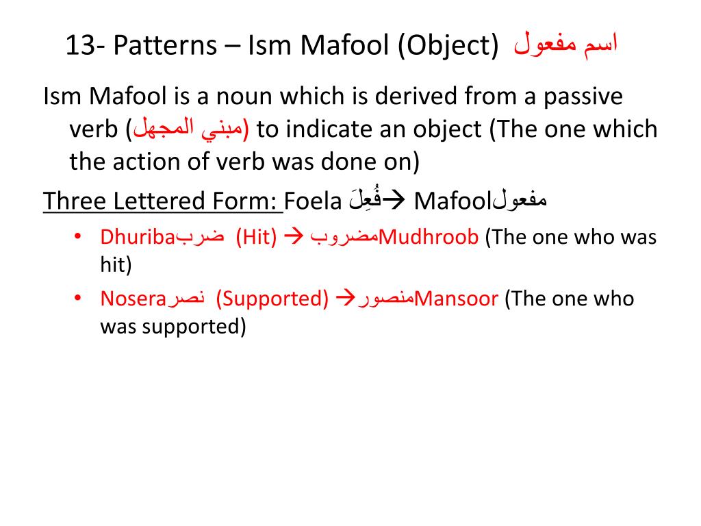 13- Patterns – Ism Mafool (Object) اسم مفعول Ism Mafool is a noun which is derived from a passive verb (مبني المجهل) to indicate an object (The one which the action of verb was done on) Three Lettered Form: Foela فُعِلَ Mafoolمفعول • Dhuriba ضرب (Hit) مضروبMudhroob (The one who was hit) • Nosera نصر (Supported) منصورMansoor (The one who was supported)