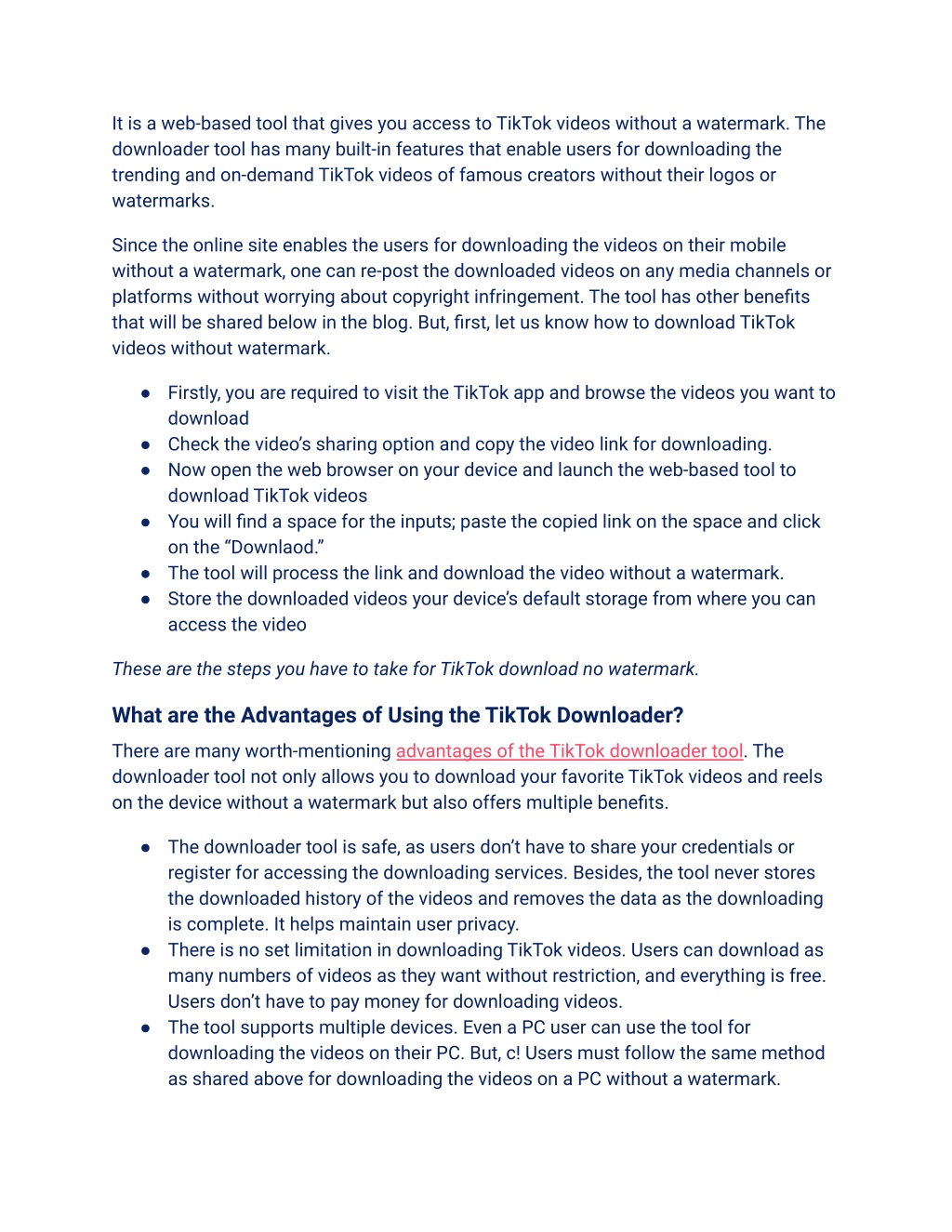 It is a web-based tool that gives you access to TikTok videos without a watermark. The downloader tool has many built-in features that enable users for downloading the trending and on-demand TikTok videos of famous creators without their logos or watermarks. Since the online site enables the users for downloading the videos on their mobile without a watermark, one can re-post the downloaded videos on any media channels or platforms without worrying about copyright infringement. The tool has other benefits that will be shared below in the blog. But, first, let us know how to download TikTok videos without watermark. ● Firstly, you are required to visit the TikTok app and browse the videos you want to download ● Check the video’s sharing option and copy the video link for downloading. ● Now open the web browser on your device and launch the web-based tool to download TikTok videos ● You will find a space for the inputs; paste the copied link on the space and click on the “Downlaod.” ● The tool will process the link and download the video without a watermark. ● Store the downloaded videos your device’s default storage from where you can access the video These are the steps you have to take for TikTok download no watermark. What are the Advantages of Using the TikTok Downloader? There are many worth-mentioning advantages of the TikTok downloader tool. The downloader tool not only allows you to download your favorite TikTok videos and reels on the device without a watermark but also offers multiple benefits. ● The downloader tool is safe, as users don’t have to share your credentials or register for accessing the downloading services. Besides, the tool never stores the downloaded history of the videos and removes the data as the downloading is complete. It helps maintain user privacy. ● There is no set limitation in downloading TikTok videos. Users can download as many numbers of videos as they want without restriction, and everything is free. Users don’t have to pay money for downloading videos. ● The tool supports multiple devices. Even a PC user can use the tool for downloading the videos on their PC. But, c! Users must follow the same method as shared above for downloading the videos on a PC without a watermark.