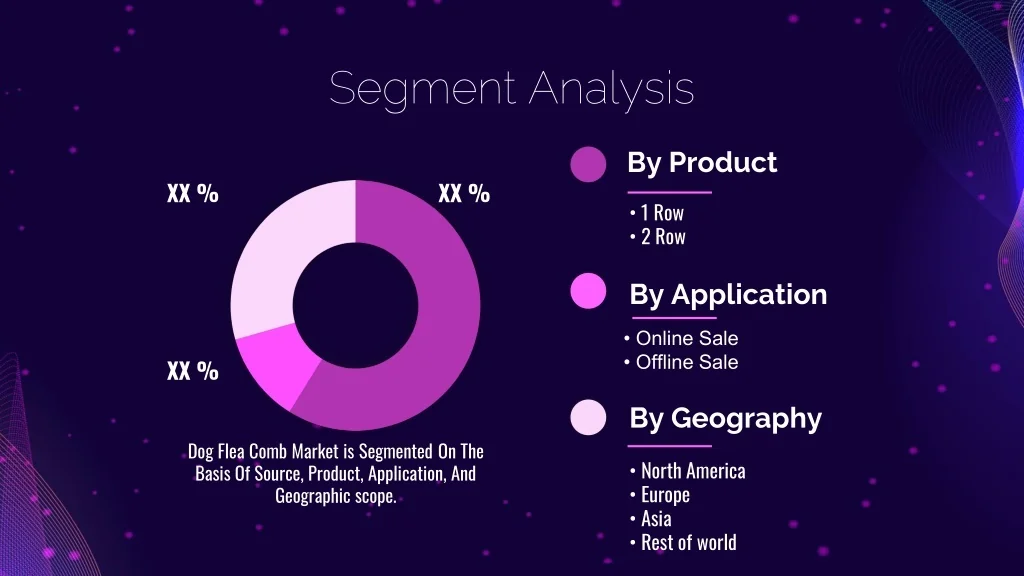 Segment Analysis • By Product XX % XX % • • 1 Row • • 2 Row • By Application • • Online Sale • • Offline Sale XX % • By Geography • Dog Flea Comb Market is Segmented On The Basis Of Source, Product, Application, And Geographic scope. • • North America • • Europe • • Asia • • Rest of world