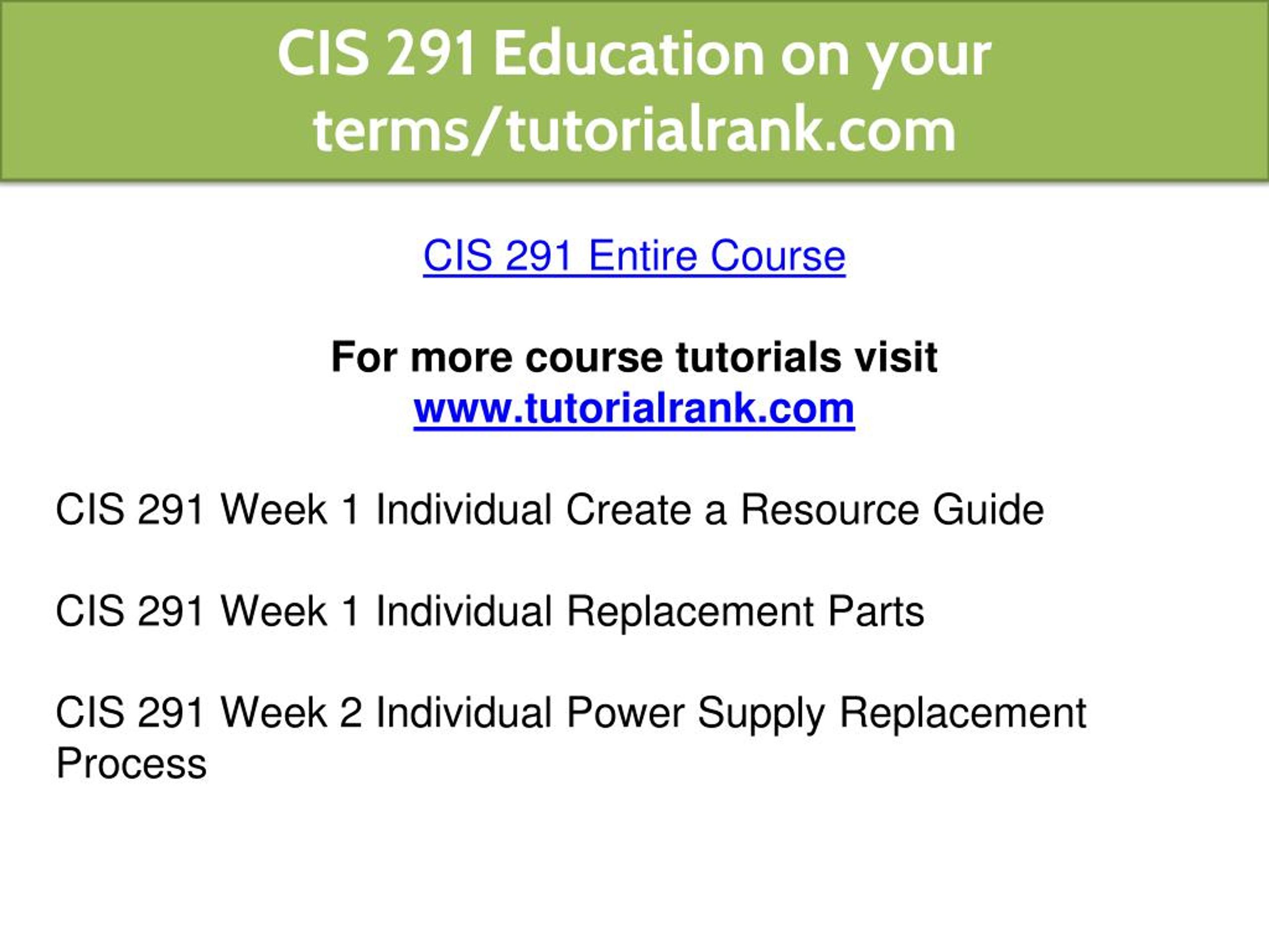 CIS 291 Education on your terms/tutorialrank.com • CIS 291 Entire Course • For more course tutorials visit • www.tutorialrank.com • CIS 291 Week 1 Individual Create a Resource Guide • CIS 291 Week 1 Individual Replacement Parts • CIS 291 Week 2 Individual Power Supply Replacement Process