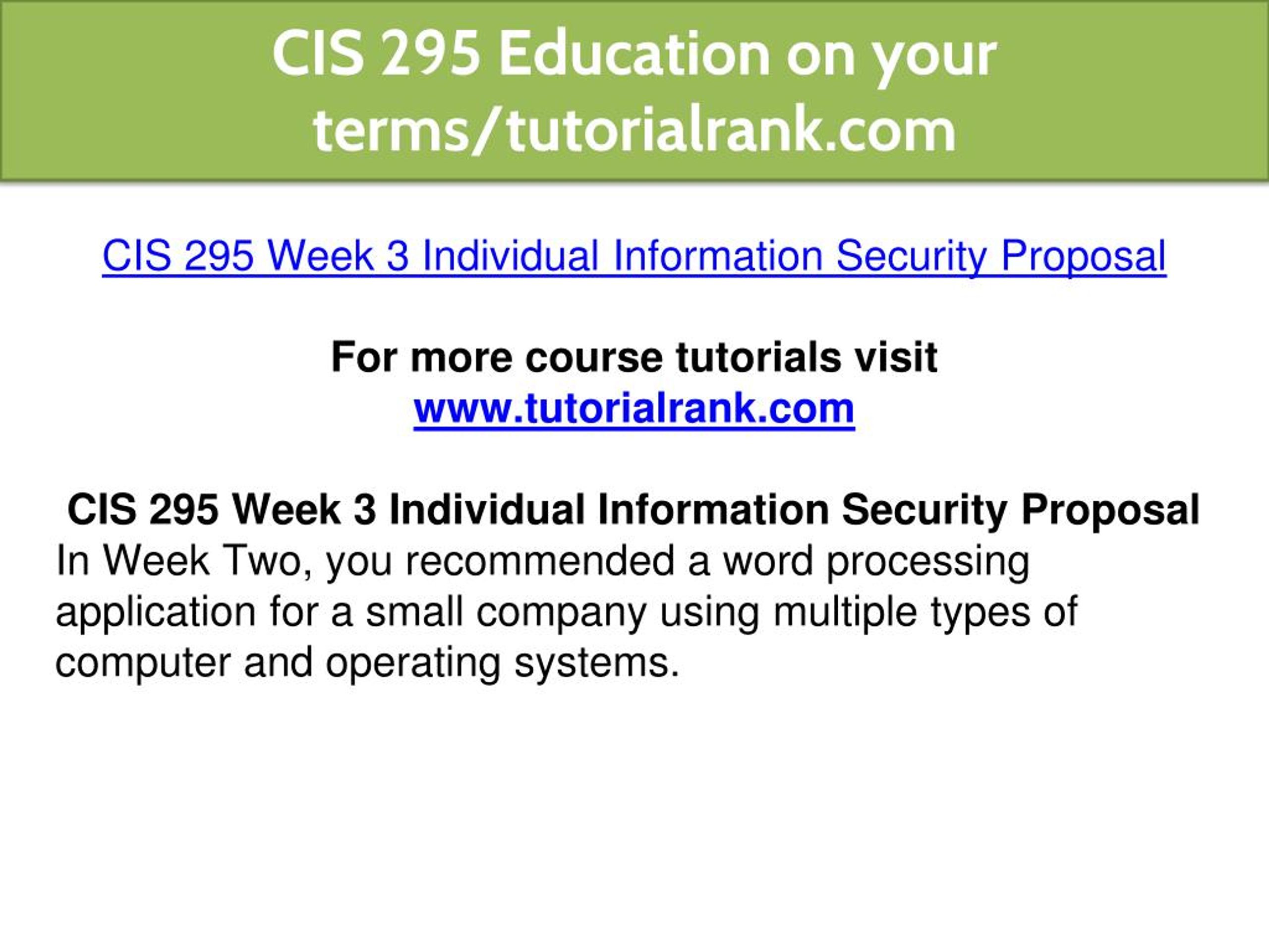 CIS 295 Education on your terms/tutorialrank.com • CIS 295 Week 3 Individual Information Security Proposal • For more course tutorials visit • www.tutorialrank.com • CIS 295 Week 3 Individual Information Security Proposal • In Week Two, you recommended a word processing application for a small company using multiple types of computer and operating systems.