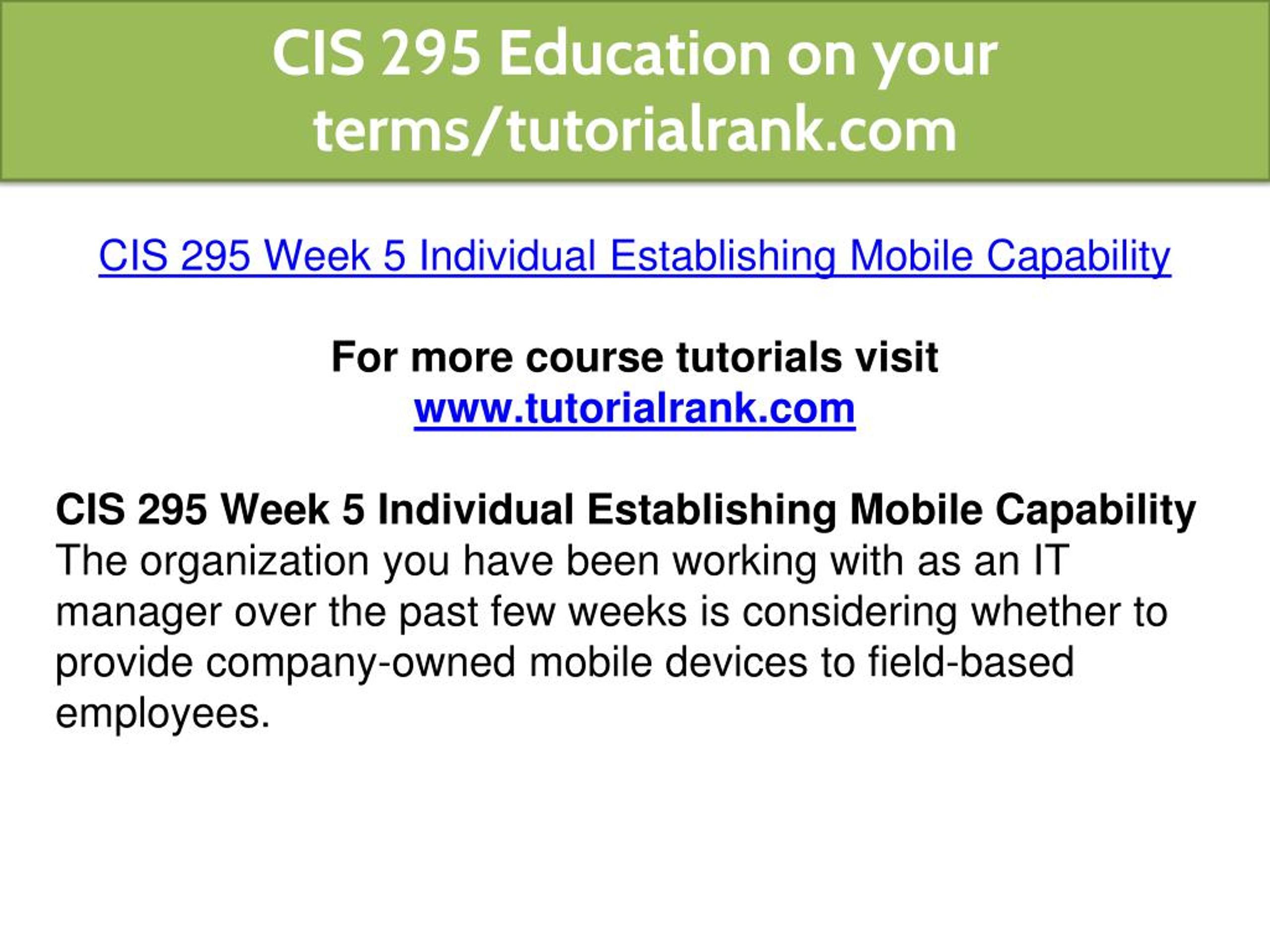 CIS 295 Education on your terms/tutorialrank.com • CIS 295 Week 5 Individual Establishing Mobile Capability • For more course tutorials visit • www.tutorialrank.com • CIS 295 Week 5 Individual Establishing Mobile Capability • The organization you have been working with as an IT manager over the past few weeks is considering whether to provide company-owned mobile devices to field-based employees.
