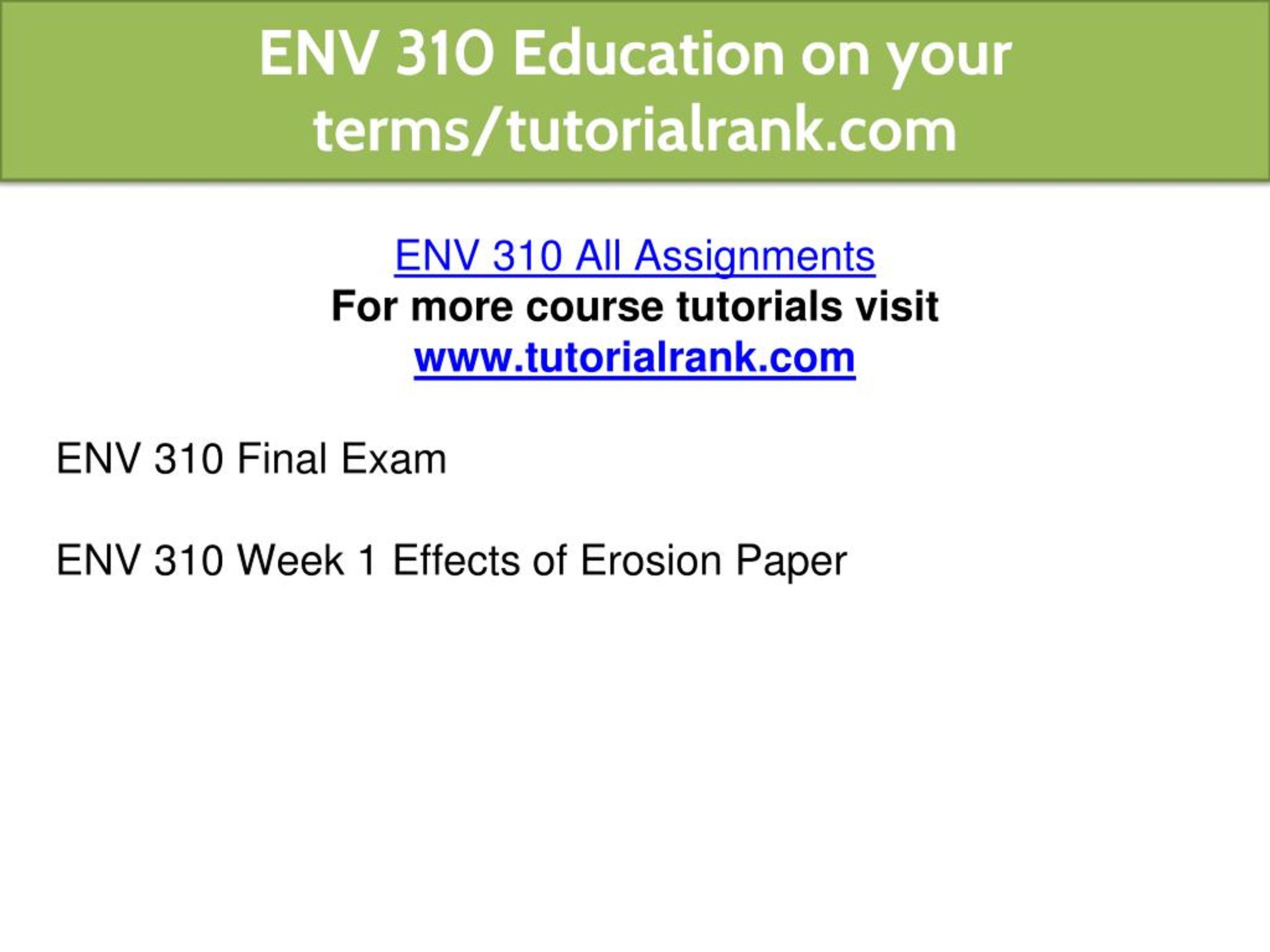 ENV 310 Education on your terms/tutorialrank.com • ENV 310 All Assignments • For more course tutorials visit • www.tutorialrank.com • ENV 310 Final Exam • ENV 310 Week 1 Effects of Erosion Paper