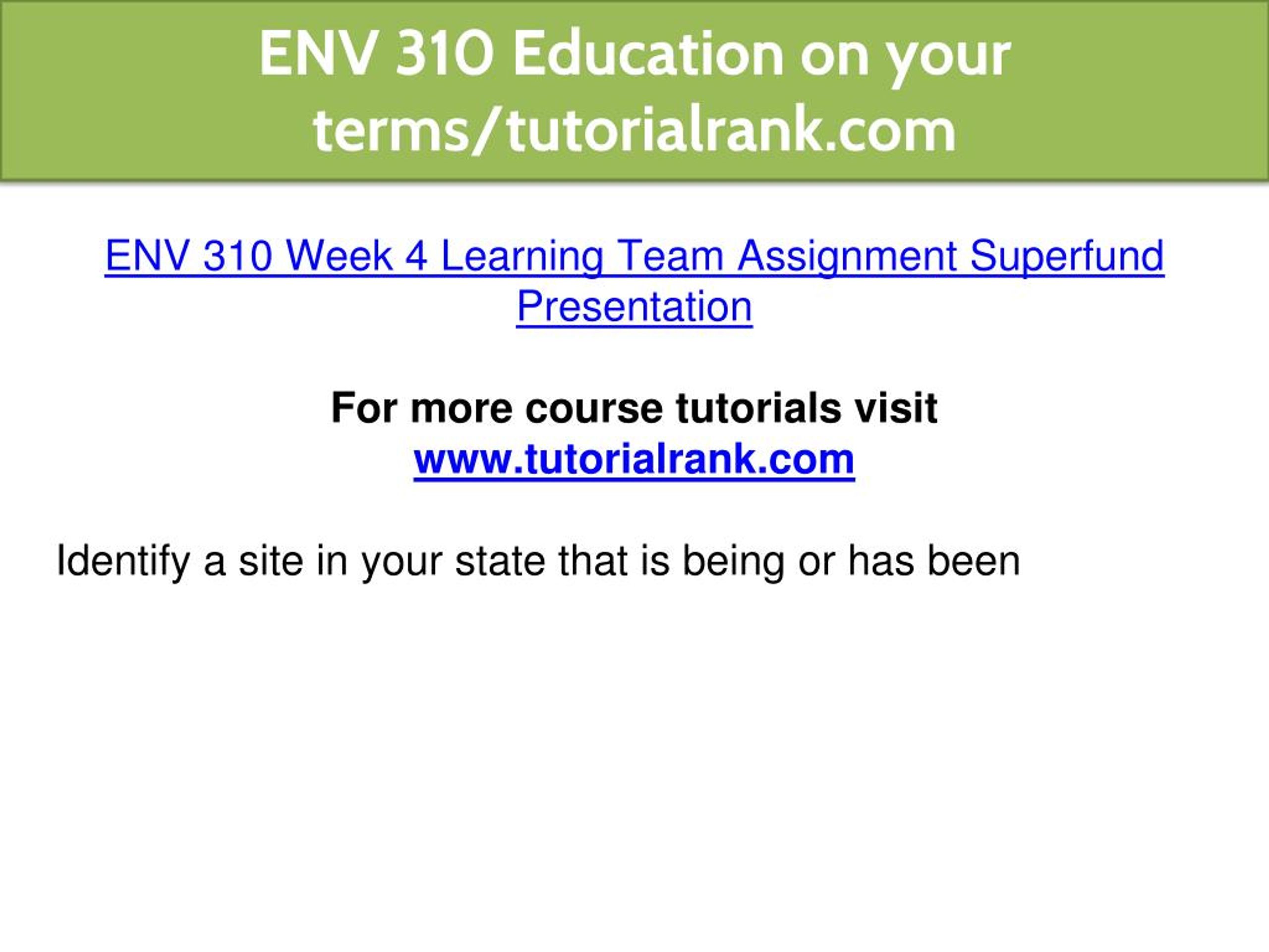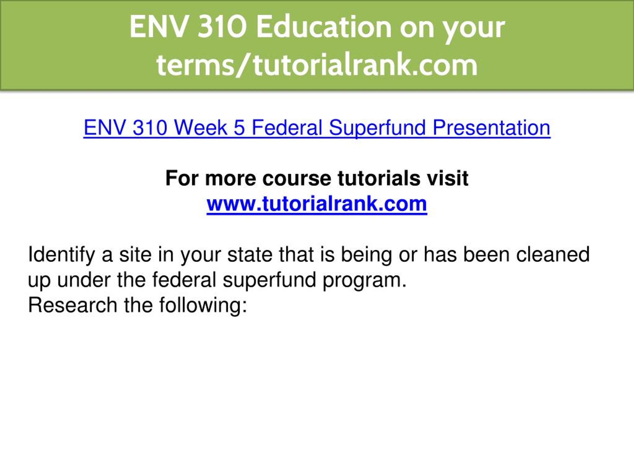 ENV 310 Education on your terms/tutorialrank.com ENV 310 Week 4 Learning Team Assignment Superfund Presentation For more course tutorials visit www.tutorialrank.com Identify a site in your state that is being or has been