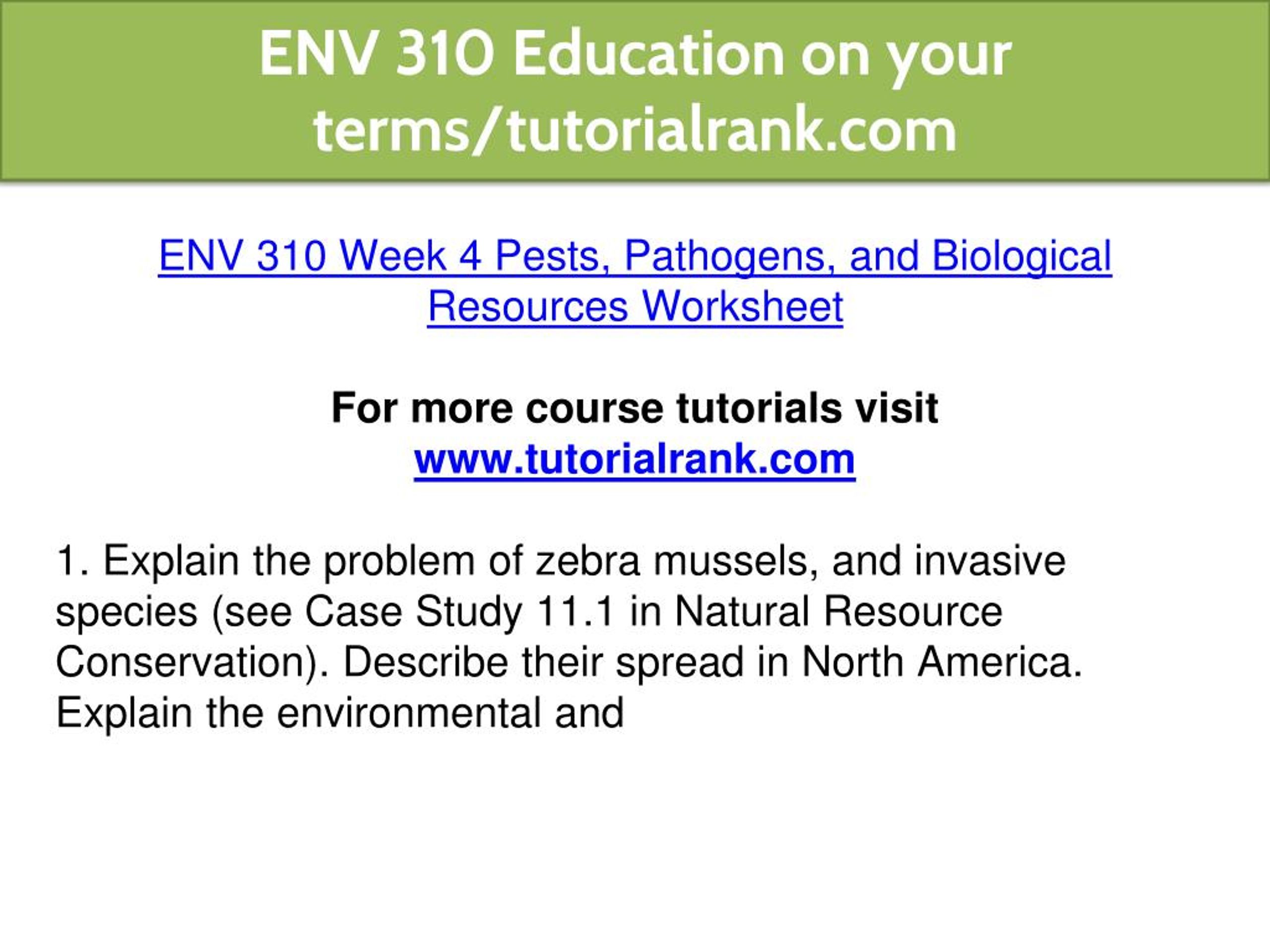 ENV 310 Education on your terms/tutorialrank.com ENV 310 Week 4 Pests, Pathogens, and Biological Resources Worksheet For more course tutorials visit www.tutorialrank.com 1. Explain the problem of zebra mussels, and invasive species (see Case Study 11.1 in Natural Resource Conservation). Describe their spread in North America. Explain the environmental and