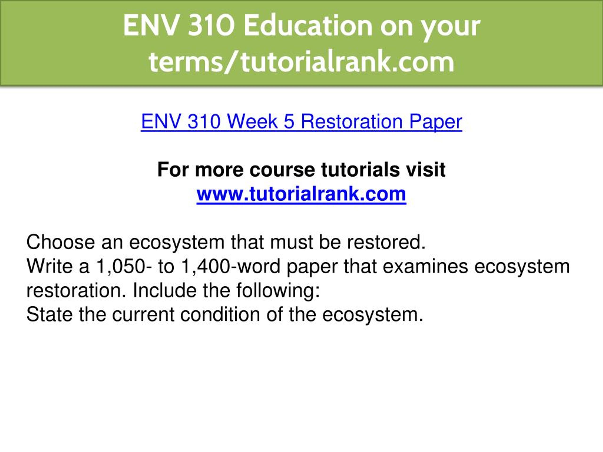 ENV 310 Education on your terms/tutorialrank.com • ENV 310 Week 5 Restoration Paper • For more course tutorials visit • www.tutorialrank.com • Choose an ecosystem that must be restored. • Write a 1,050- to 1,400-word paper that examines ecosystem restoration. Include the following: • State the current condition of the ecosystem.