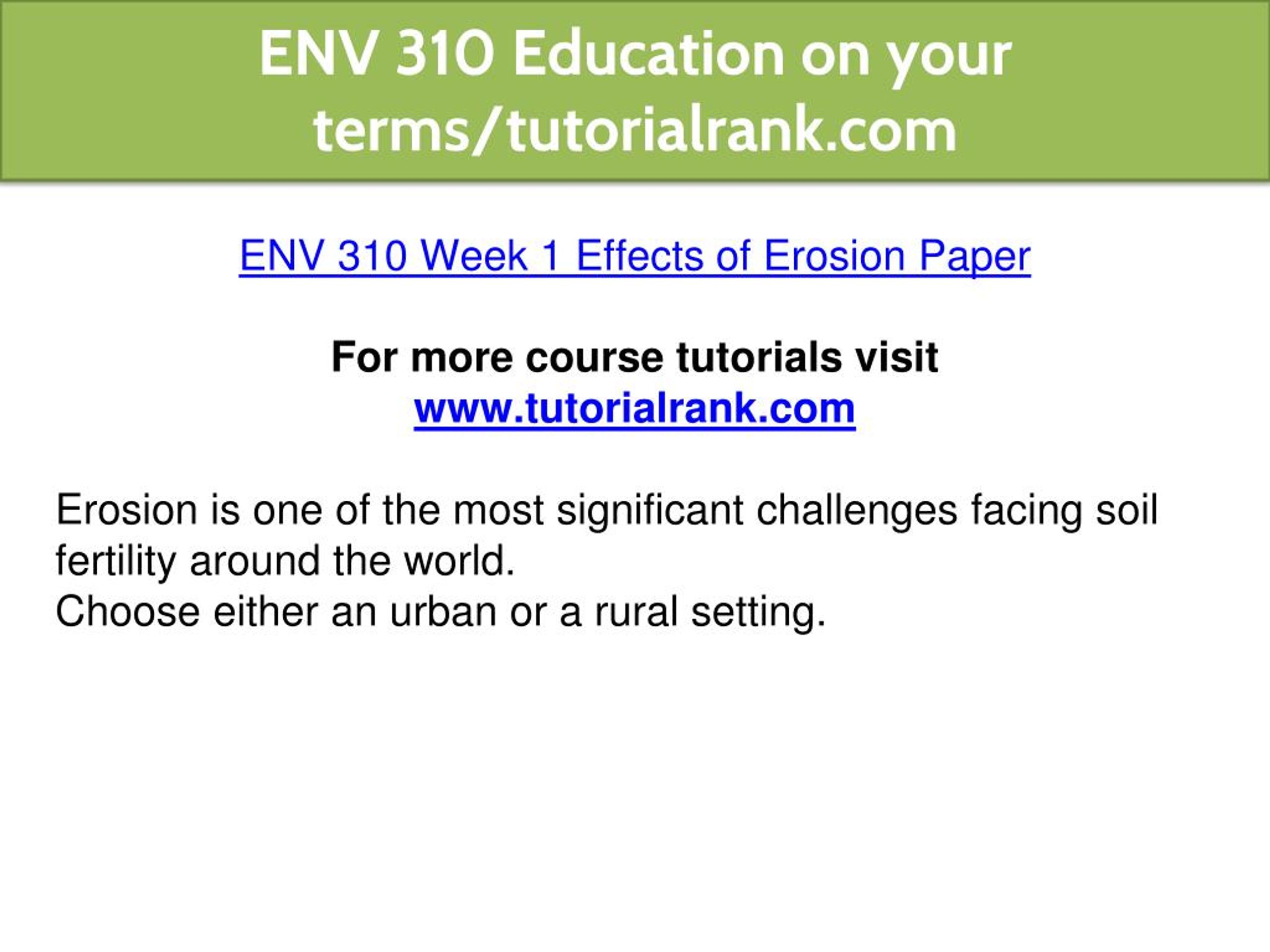 ENV 310 Education on your terms/tutorialrank.com • ENV 310 Week 1 Effects of Erosion Paper • For more course tutorials visit • www.tutorialrank.com • Erosion is one of the most significant challenges facing soil fertility around the world. • Choose either an urban or a rural setting.