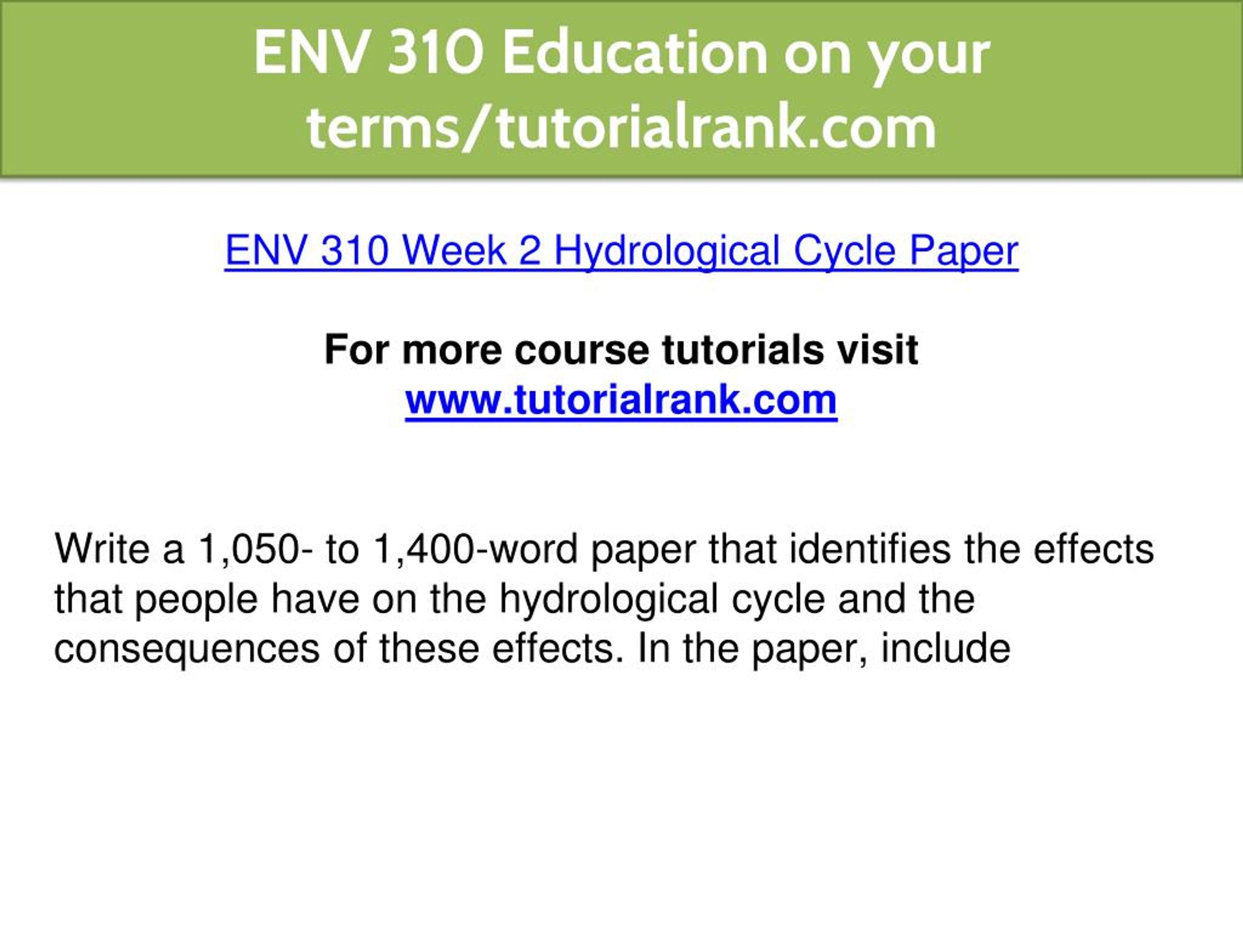 ENV 310 Education on your terms/tutorialrank.com ENV 310 Week 2 Hydrological Cycle Paper For more course tutorials visit www.tutorialrank.com Write a 1,050- to 1,400-word paper that identifies the effects that people have on the hydrological cycle and the consequences of these effects. In the paper, include
