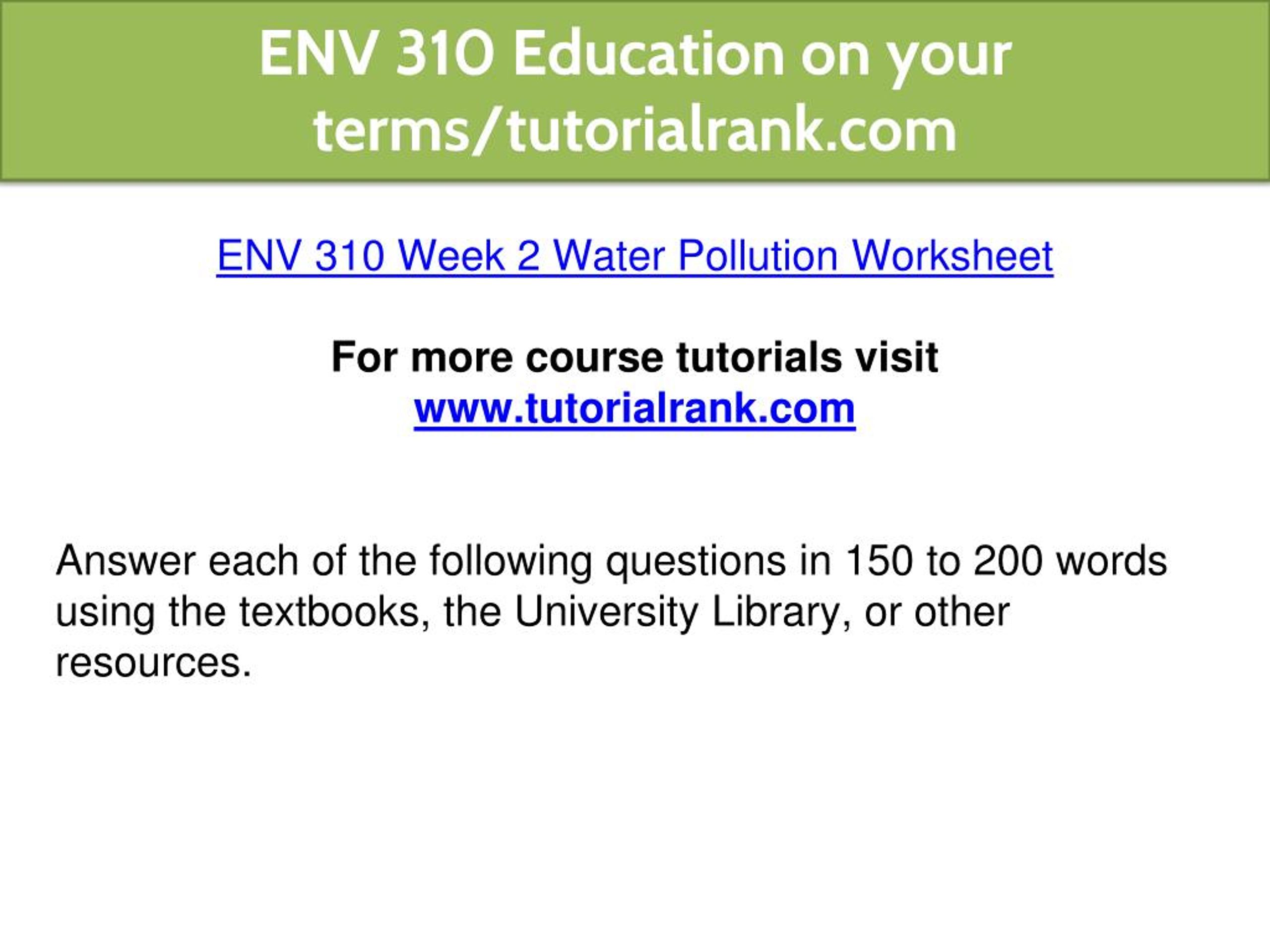 ENV 310 Education on your terms/tutorialrank.com • ENV 310 Week 2 Water Pollution Worksheet • For more course tutorials visit • www.tutorialrank.com • Answer each of the following questions in 150 to 200 words using the textbooks, the University Library, or other resources.
