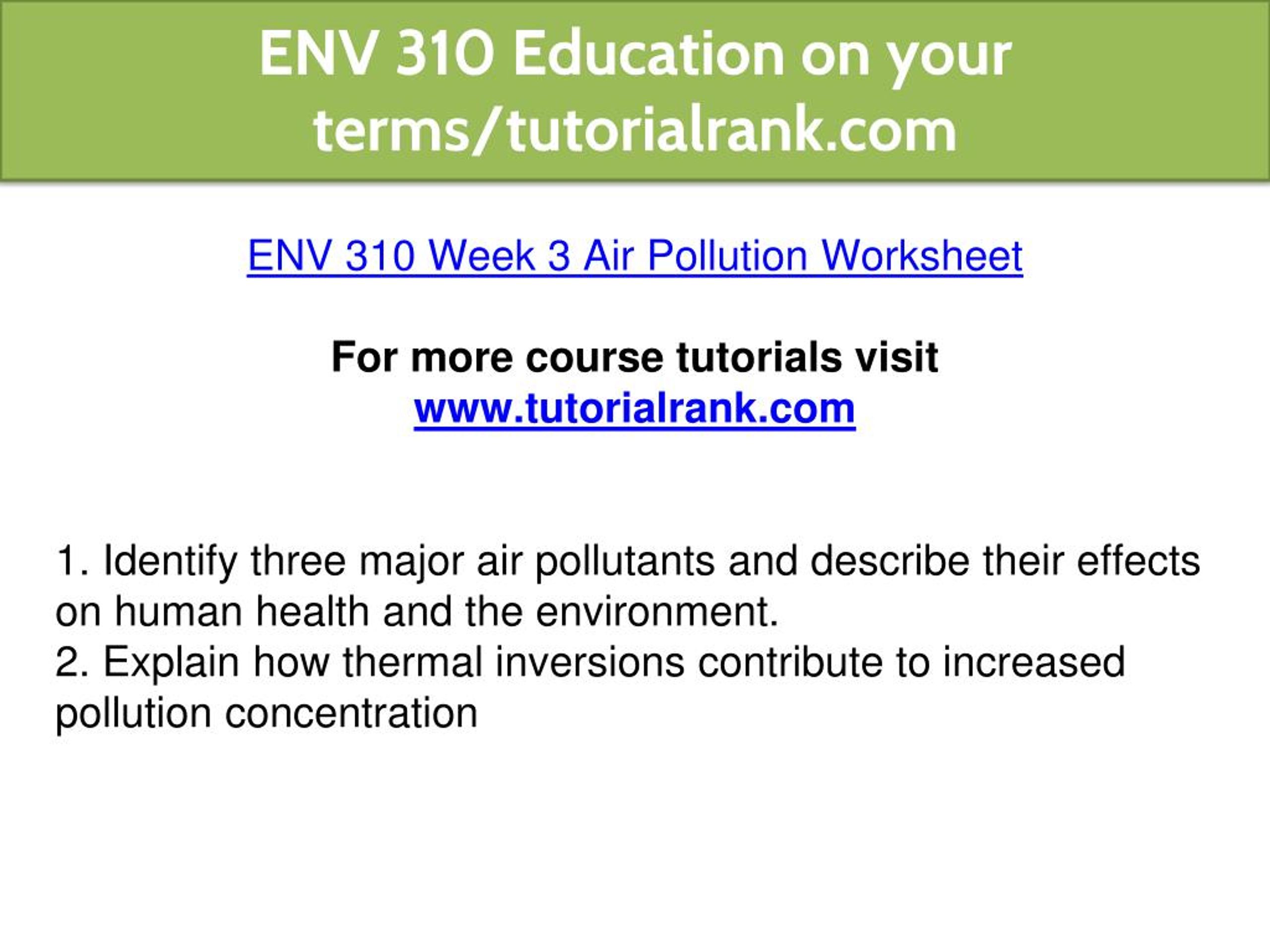 ENV 310 Education on your terms/tutorialrank.com • ENV 310 Week 3 Air Pollution Worksheet • For more course tutorials visit • www.tutorialrank.com • 1. Identify three major air pollutants and describe their effects on human health and the environment. • 2. Explain how thermal inversions contribute to increased pollution concentration