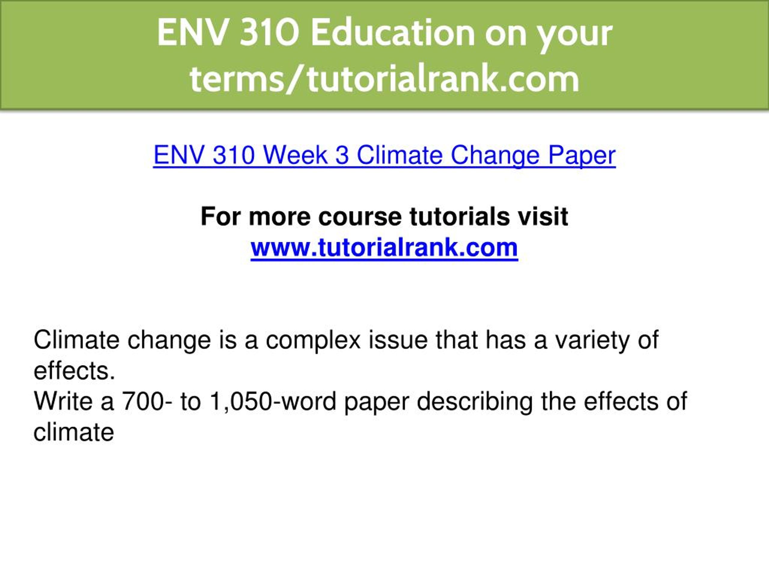 ENV 310 Education on your terms/tutorialrank.com ENV 310 Week 3 Climate Change Paper For more course tutorials visit www.tutorialrank.com Climate change is a complex issue that has a variety of effects. Write a 700- to 1,050-word paper describing the effects of climate