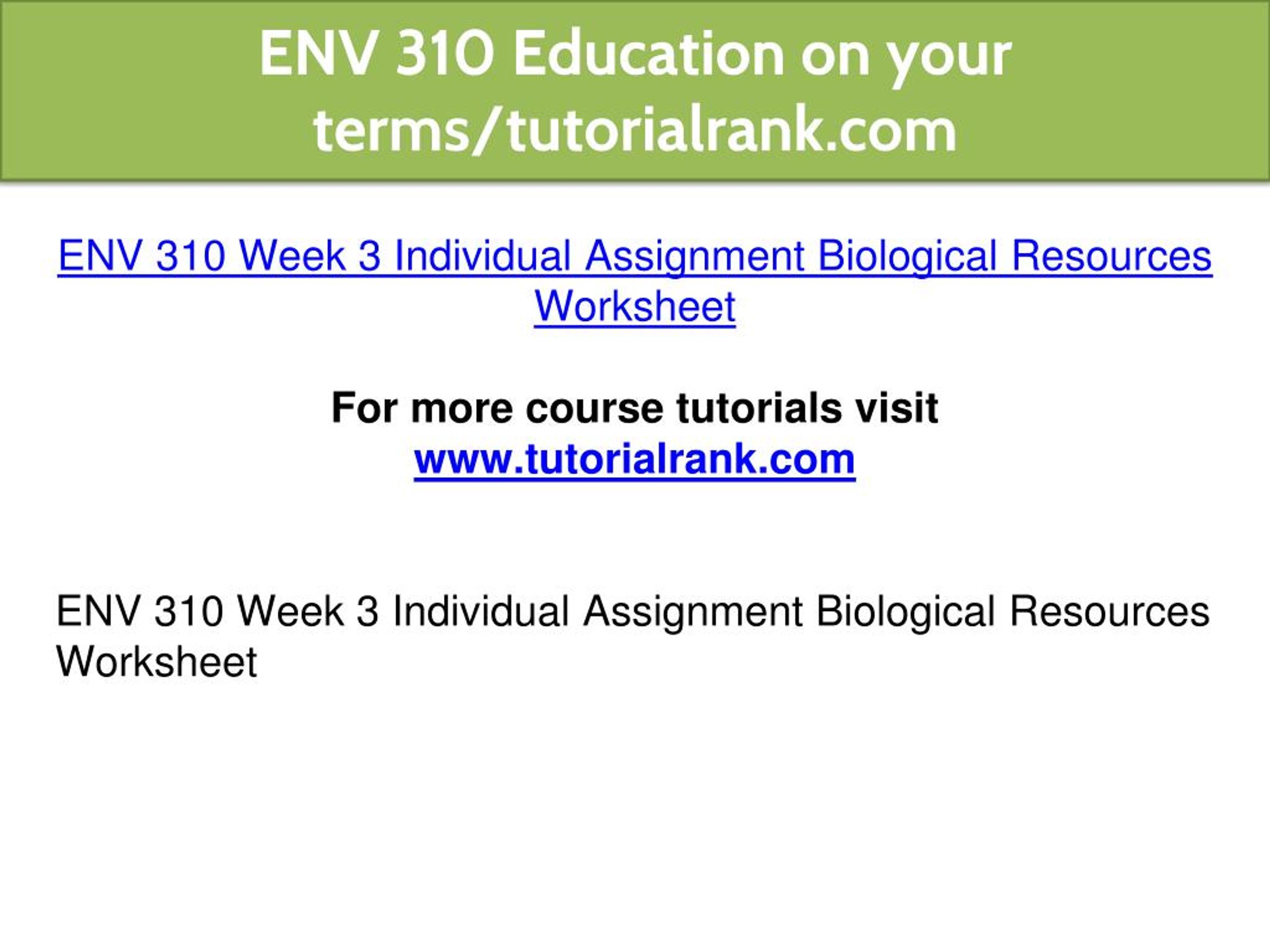 ENV 310 Education on your terms/tutorialrank.com • ENV 310 Week 3 Individual Assignment Biological Resources Worksheet • For more course tutorials visit • www.tutorialrank.com • ENV 310 Week 3 Individual Assignment Biological Resources Worksheet
