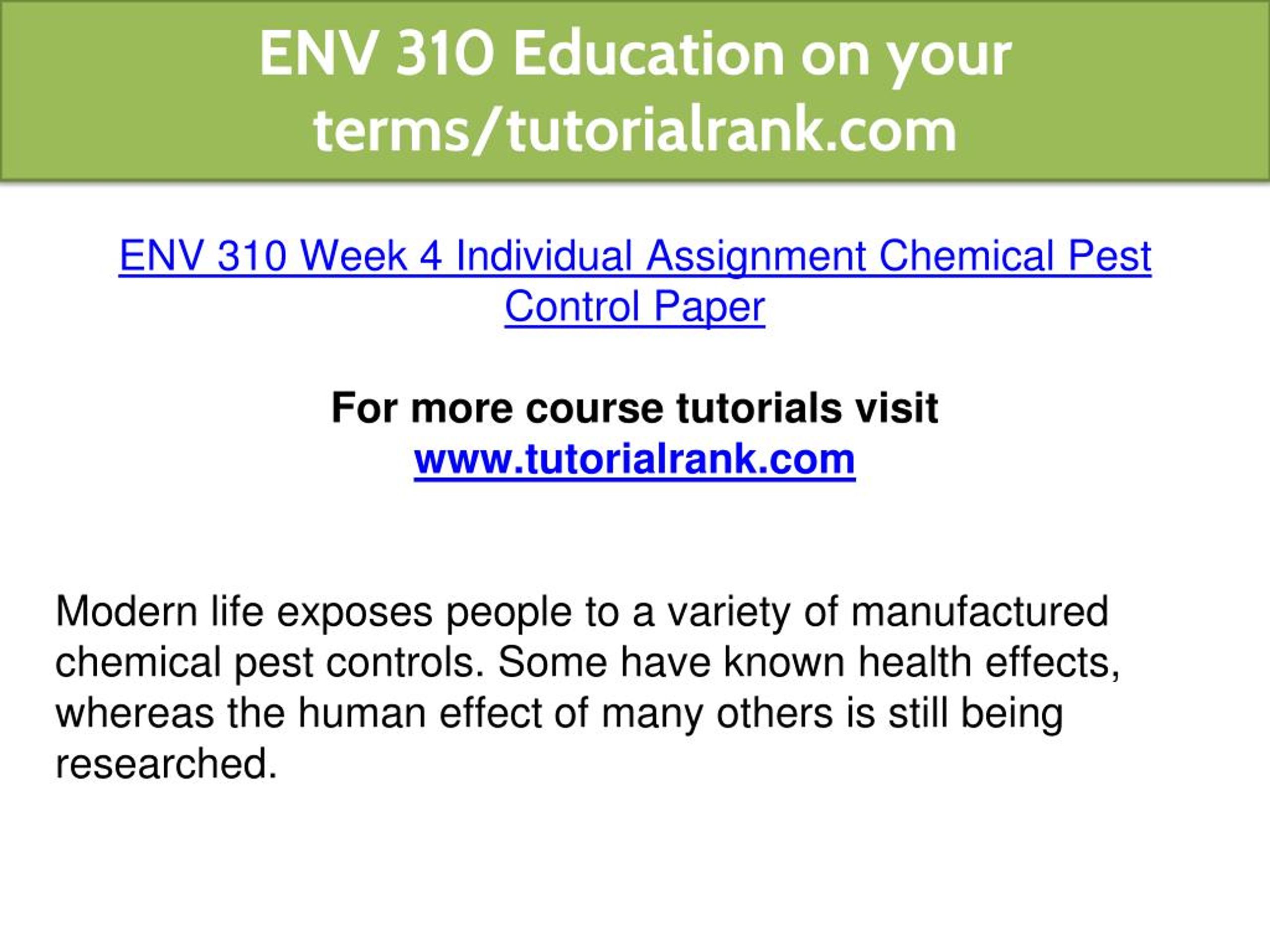 ENV 310 Education on your terms/tutorialrank.com • ENV 310 Week 4 Individual Assignment Chemical Pest Control Paper • For more course tutorials visit • www.tutorialrank.com • Modern life exposes people to a variety of manufactured chemical pest controls. Some have known health effects, whereas the human effect of many others is still being researched.