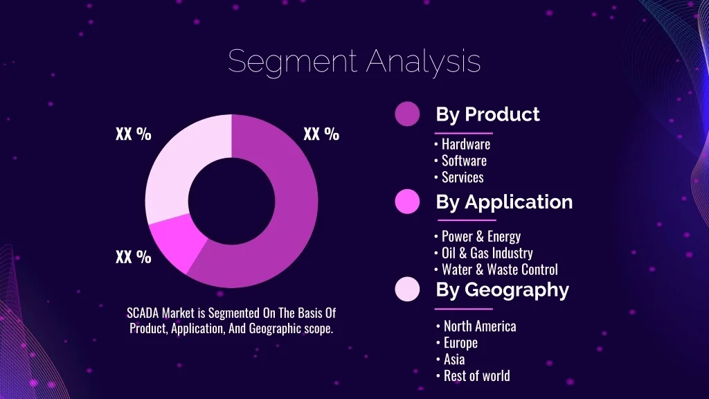 Segment Analysis By Product XX % XX % • • Hardware • • Software • • Services • By Application • • Power & Energy • • Oil & Gas Industry • • Water & Waste Control XX % • By Geography • SCADA Market is Segmented On The Basis Of Product, Application, And Geographic scope. • • North America • • Europe • • Asia • • Rest of world