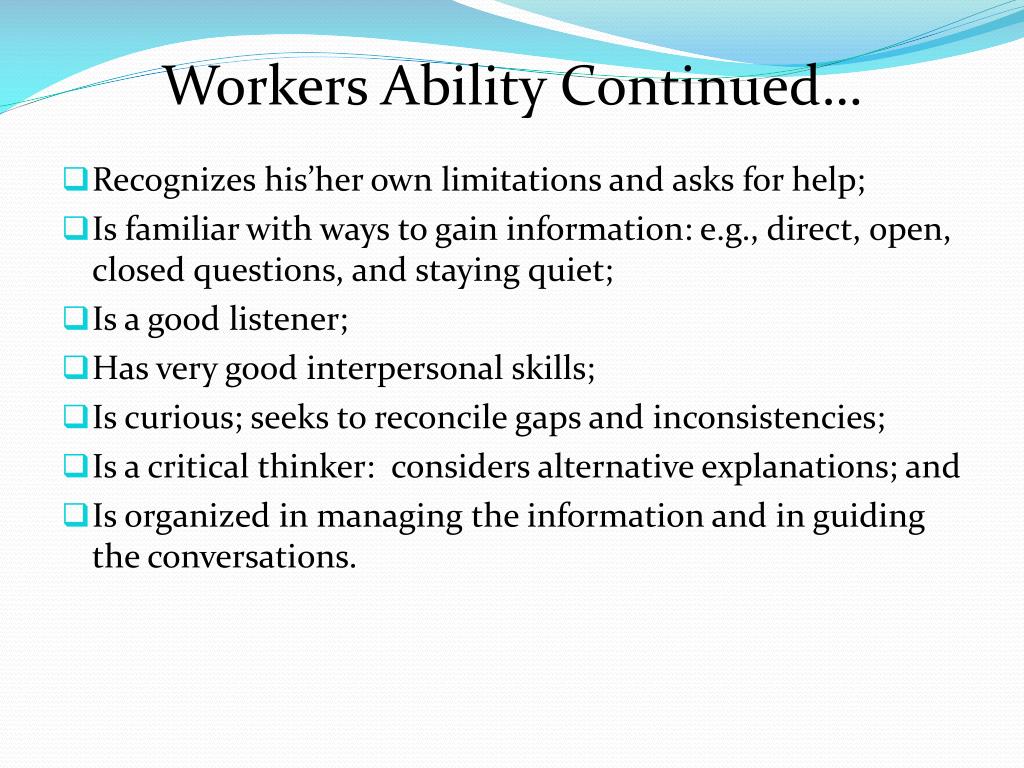 Workers Ability Continued… • Recognizes his’her own limitations and asks for help; • Is familiar with ways to gain information: e.g., direct, open, closed questions, and staying quiet; • Is a good listener; • Has very good interpersonal skills; • Is curious; seeks to reconcile gaps and inconsistencies; • Is a critical thinker: considers alternative explanations; and • Is organized in managing the information and in guiding the conversations.