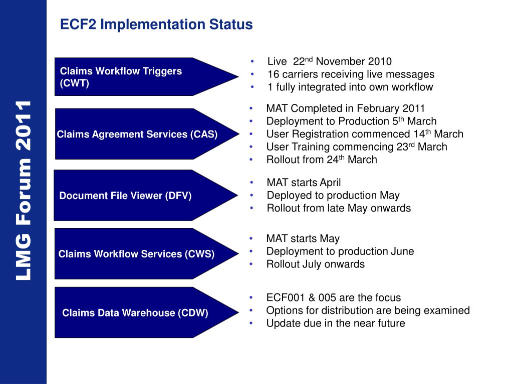 ECF2 Implementation Status • Live 22nd November 2010 • 16 carriers receiving live messages • 1 fully integrated into own workflow Claims Workflow Triggers (CWT) • MAT Completed in February 2011 • Deployment to Production 5th March • User Registration commenced 14th March • User Training commencing 23rd March • Rollout from 24th March Claims Agreement Services (CAS) Document File Viewer (DFV) • MAT starts April • Deployed to production May • Rollout from late May onwards Claims Workflow Services (CWS) • MAT starts May • Deployment to production June • Rollout July onwards Claims Data Warehouse (CDW) • ECF001 & 005 are the focus • Options for distribution are being examined • Update due in the near future