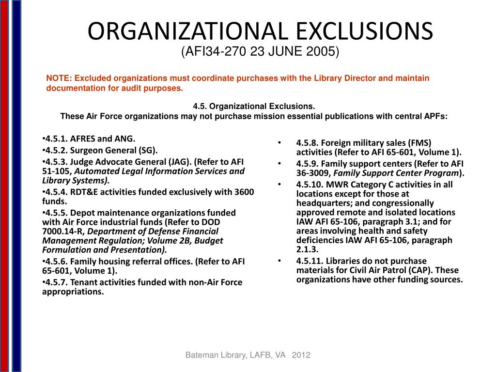 ORGANIZATIONAL EXCLUSIONS (AFI34-270 23 JUNE 2005) NOTE: Excluded organizations must coordinate purchases with the Library Director and maintain documentation for audit purposes. 4.5. Organizational Exclusions. These Air Force organizations may not purchase mission essential publications with central APFs: • 4.5.1. AFRES and ANG. • 4.5.2. Surgeon General (SG). • 4.5.3. Judge Advocate General (JAG). (Refer to AFI 51-105, Automated Legal Information Services and Library Systems). • 4.5.4. RDT&E activities funded exclusively with 3600 funds. • 4.5.5. Depot maintenance organizations funded with Air Force industrial funds (Refer to DOD 7000.14-R, Department of Defense Financial Management Regulation; Volume 2B, Budget Formulation and Presentation). • 4.5.6. Family housing referral offices. (Refer to AFI 65-601, Volume 1). • 4.5.7. Tenant activities funded with non-Air Force appropriations. • 4.5.8. Foreign military sales (FMS) activities (Refer to AFI 65-601, Volume 1). • 4.5.9. Family support centers (Refer to AFI 36-3009, Family Support Center Program). • 4.5.10. MWR Category C activities in all locations except for those at headquarters; and congressionally approved remote and isolated locations IAW AFI 65-106, paragraph 3.1; and for areas involving health and safety deficiencies IAW AFI 65-106, paragraph 2.1.3. • 4.5.11. Libraries do not purchase materials for Civil Air Patrol (CAP). These organizations have other funding sources. Bateman Library, LAFB, VA 2012