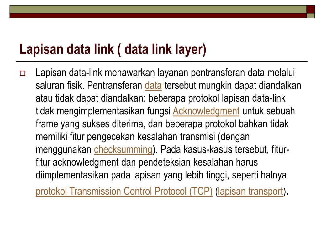 Lapisan data link ( data link layer) • Lapisan data-link menawarkan layanan pentransferan data melalui saluran fisik. Pentransferan data tersebut mungkin dapat diandalkan atau tidak dapat diandalkan: beberapa protokol lapisan data-link tidak mengimplementasikan fungsi Acknowledgment untuk sebuah frame yang sukses diterima, dan beberapa protokol bahkan tidak memiliki fitur pengecekan kesalahan transmisi (dengan menggunakan checksumming). Pada kasus-kasus tersebut, fitur-fitur acknowledgment dan pendeteksian kesalahan harus diimplementasikan pada lapisan yang lebih tinggi, seperti halnya protokol Transmission Control Protocol (TCP) (lapisan transport).