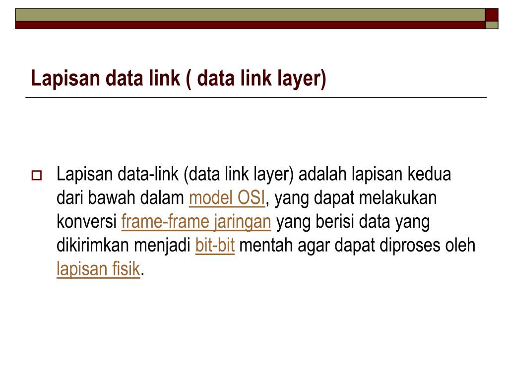 Lapisan data link ( data link layer) • Lapisan data-link (data link layer) adalah lapisan kedua dari bawah dalam model OSI, yang dapat melakukan konversi frame-frame jaringan yang berisi data yang dikirimkan menjadi bit-bit mentah agar dapat diproses oleh lapisan fisik.
