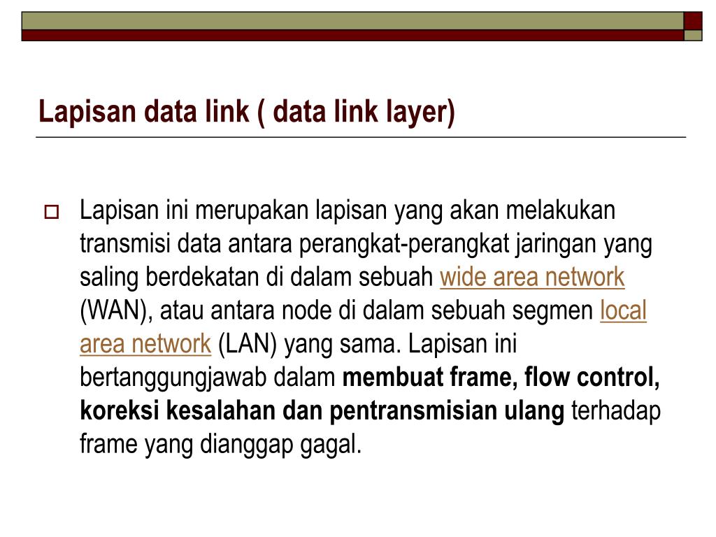 Lapisan data link ( data link layer) • Lapisan ini merupakan lapisan yang akan melakukan transmisi data antara perangkat-perangkat jaringan yang saling berdekatan di dalam sebuah wide area network (WAN), atau antara node di dalam sebuah segmen local area network (LAN) yang sama. Lapisan ini bertanggungjawab dalam membuat frame, flow control, koreksi kesalahan dan pentransmisian ulang terhadap frame yang dianggap gagal.