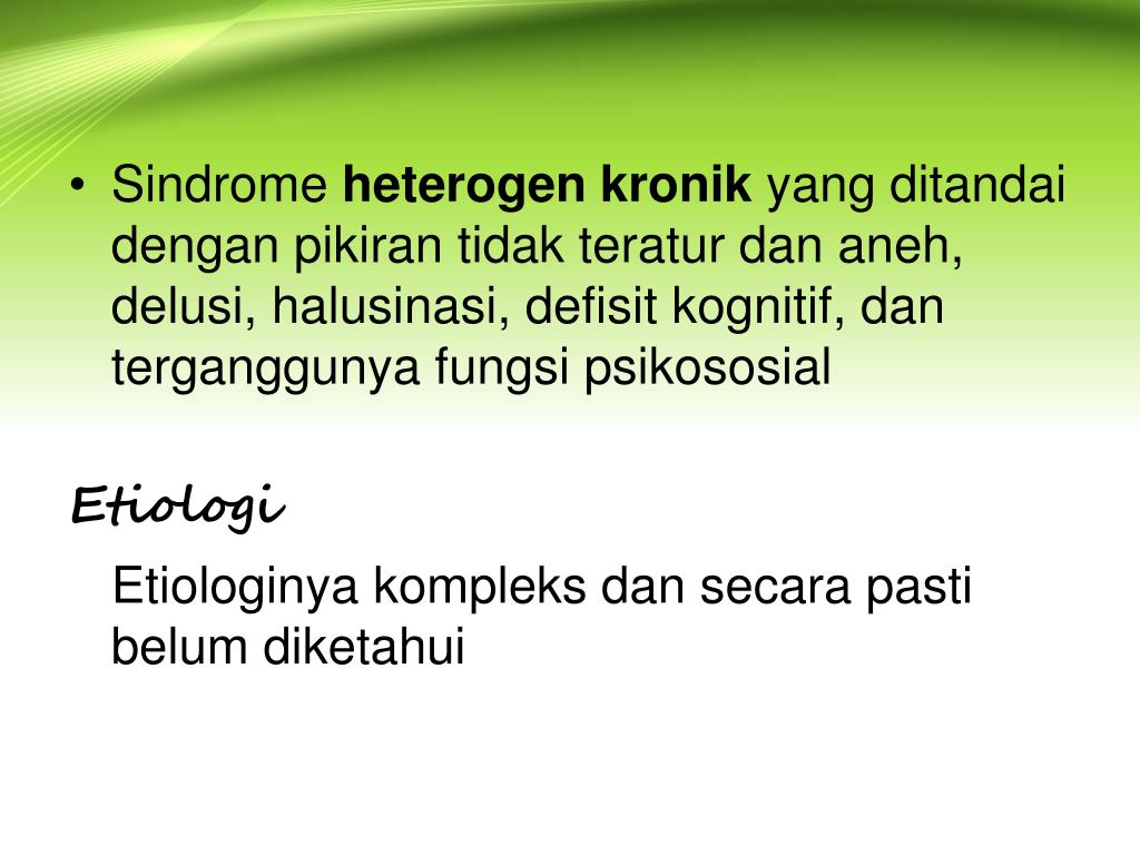 Sindrome heterogen kronik yang ditandai dengan pikiran tidak teratur dan aneh, delusi, halusinasi, defisit kognitif, dan terganggunya fungsi psikososial Etiologi Etiologinya kompleks dan secara pasti belum diketahui