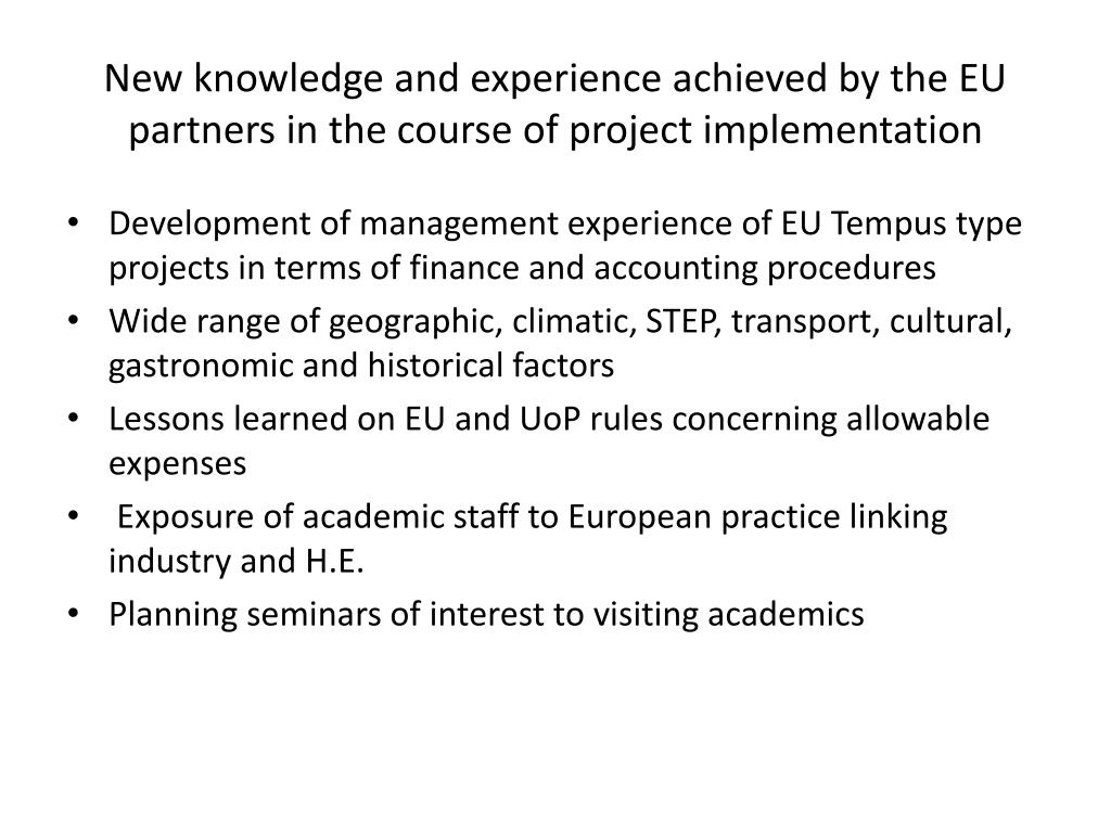 New knowledge and experience achieved by the EU partners in the course of project implementation • Development of management experience of EU Tempus type projects in terms of finance and accounting procedures • Wide range of geographic, climatic, STEP, transport, cultural, gastronomic and historical factors • Lessons learned on EU and UoP rules concerning allowable expenses • Exposure of academic staff to European practice linking industry and H.E. • Planning seminars of interest to visiting academics