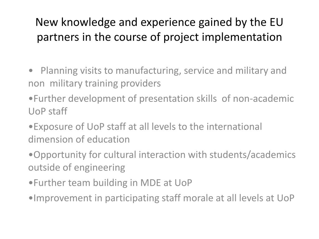 New knowledge and experience gained by the EU partners in the course of project implementation • Planning visits to manufacturing, service and military and non military training providers •Further development of presentation skills of non-academic UoPstaff •Exposure of UoP staff at all levels to the international dimension of education •Opportunity for cultural interaction with students/academics outside of engineering •Further team building in MDE at UoP •Improvement in participating staff morale at all levels at UoP