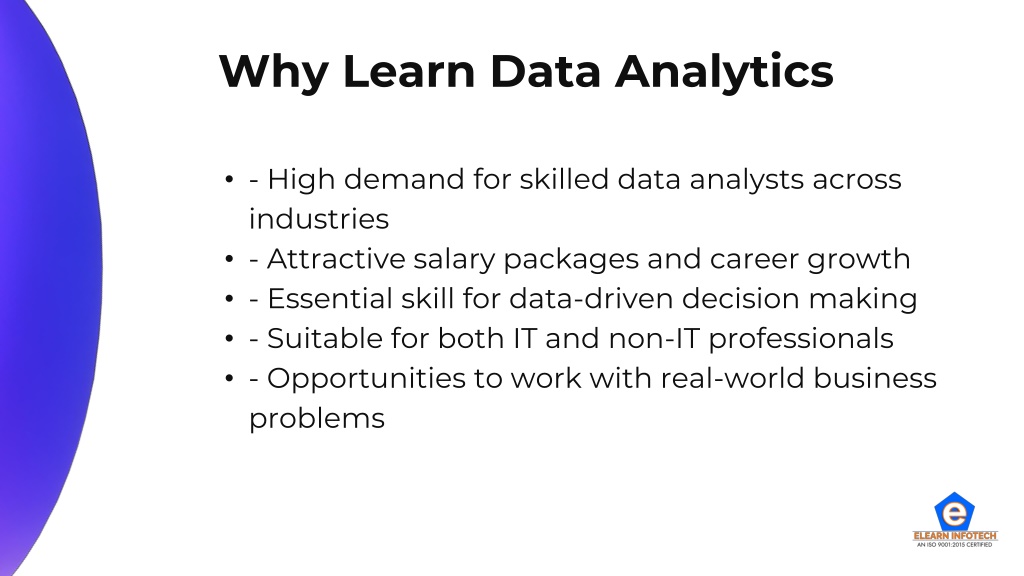 Why Learn Data Analytics • - High demand for skilled data analysts across industries • - Attractive salary packages and career growth • - Essential skill for data-driven decision making • - Suitable for both IT and non-IT professionals • - Opportunities to work with real-world business problems