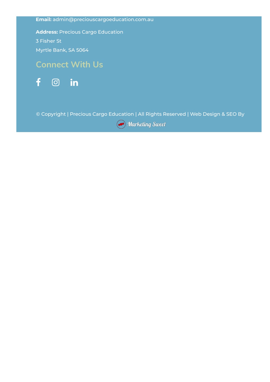 Email: admin@preciouscargoeducation.com.au Address: Precious Cargo Education 3 Fisher St Myrtle Bank, SA 5064 Connect With Us © Copyright | Precious Cargo Education | All Rights Reserved | Web Design & SEO By