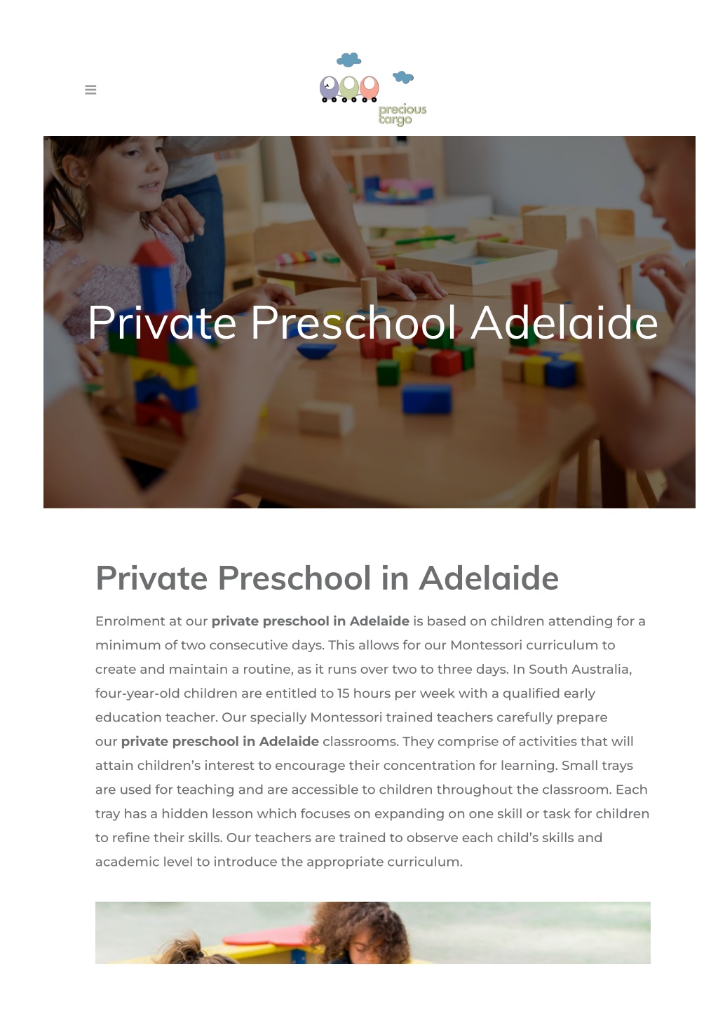 The Montessori Method Our private preschool in Adelaide focuses on the Montessori method for our teaching. Over 100 years ago the Montessori method was founded by Dr Maria Montessori. She found that children bene몭t from a speci몭c learning environment, allowing children to reach their full potential. In order for children to grow, we have created a Montessori environment that is safe, loving and respectful. This includes key characteristics such as staff, calm environment, structured environment, real-life lessons and behaviour. Creating such a learning space allows our teachers to successfully implement the Montessori curriculum and observe and introduce children to the correct stage of the curriculum. The Montessori curriculum includes lessons in the following areas: Practical life Sensorial Problem solving and mathematics Language and literacy Culture Precious Cargo Preschool Activities At Precious Cargo, our private preschool in Adelaide activities include agriculture,