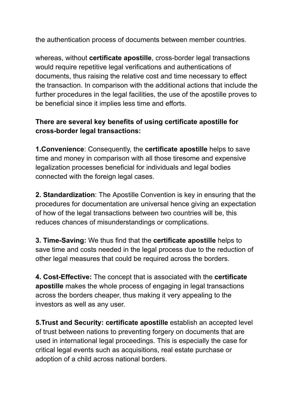 the authentication process of documents between member countries. whereas, without certificate apostille, cross-border legal transactions would require repetitive legal verifications and authentications of documents, thus raising the relative cost and time necessary to effect the transaction. In comparison with the additional actions that include the further procedures in the legal facilities, the use of the apostille proves to be beneficial since it implies less time and efforts. There are several key benefits of using certificate apostille for cross-border legal transactions: 1.Convenience: Consequently, the certificate apostille helps to save time and money in comparison with all those tiresome and expensive legalization processes beneficial for individuals and legal bodies connected with the foreign legal cases. 2.Standardization: The Apostille Convention is key in ensuring that the procedures for documentation are universal hence giving an expectation of how of the legal transactions between two countries will be, this reduces chances of misunderstandings or complications. 3. Time-Saving: We thus find that the certificate apostille helps to save time and costs needed in the legal process due to the reduction of other legal measures that could be required across the borders. 4. Cost-Effective: The concept that is associated with the certificate apostille makes the whole process of engaging in legal transactions across the borders cheaper, thus making it very appealing to the investors as well as any user. 5.Trust and Security:certificate apostille establish an accepted level of trust between nations to preventing forgery on documents that are used in international legal proceedings. This is especially the case for critical legal events such as acquisitions, real estate purchase or adoption of a child across national borders.