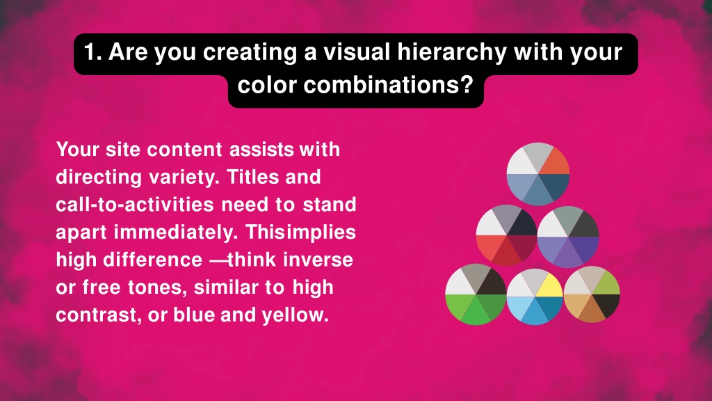 1.Areyoucreatingavisualhierarchywithyour colorcombinations? Your site content assists with directing variety. Titles and call-to-activities need to stand apart immediately. Thisimplies high difference — think inverse or free tones, similar to high contrast,orblueandyellow.