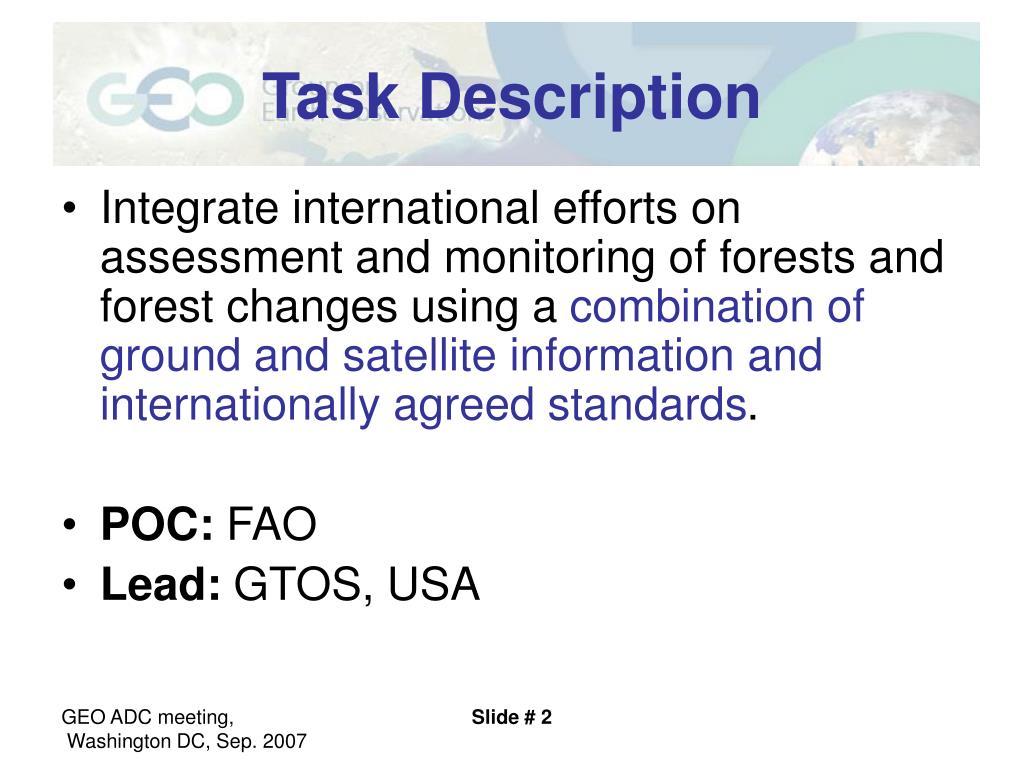 Task Description • Integrate international efforts on assessment and monitoring of forests and forest changes using a combination of ground and satellite information and internationally agreed standards. • POC: FAO • Lead: GTOS, USA Slide # 2