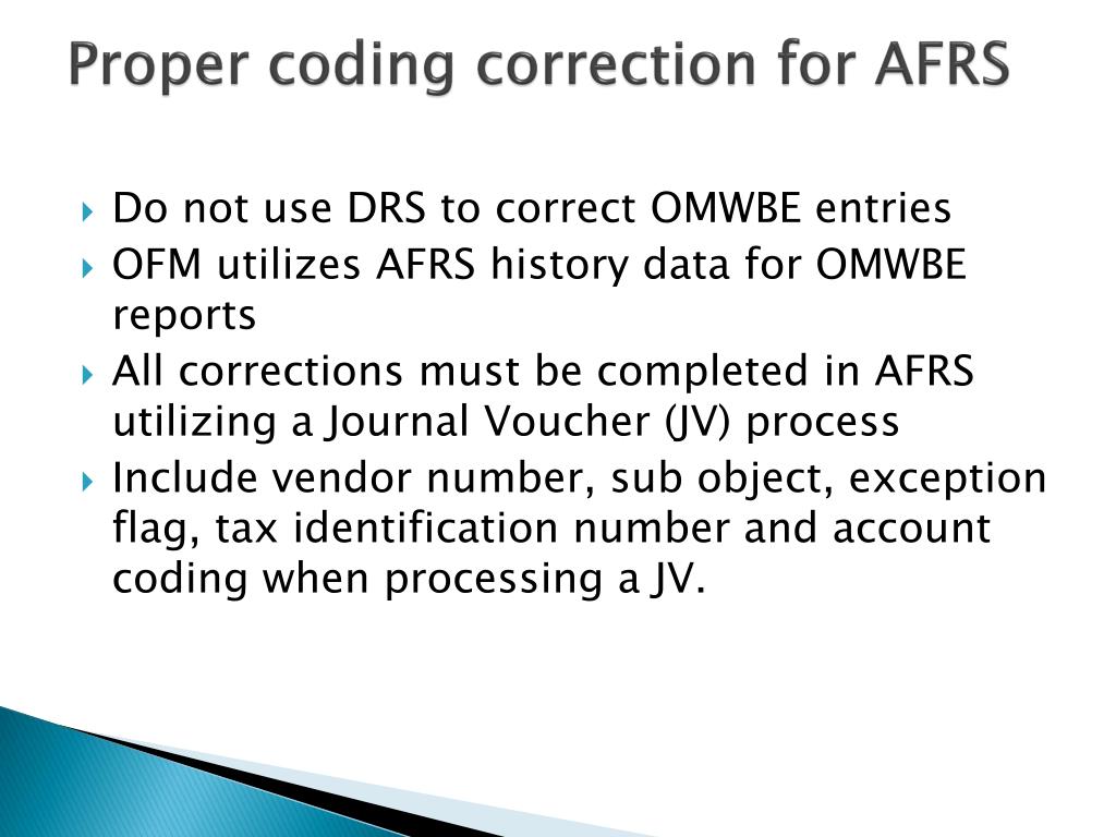 Proper coding correction for AFRS • Do not use DRS to correct OMWBE entries • OFM utilizes AFRS history data for OMWBE reports • All corrections must be completed in AFRS utilizing a Journal Voucher (JV) process • Include vendor number, sub object, exception flag, tax identification number and account coding when processing a JV.