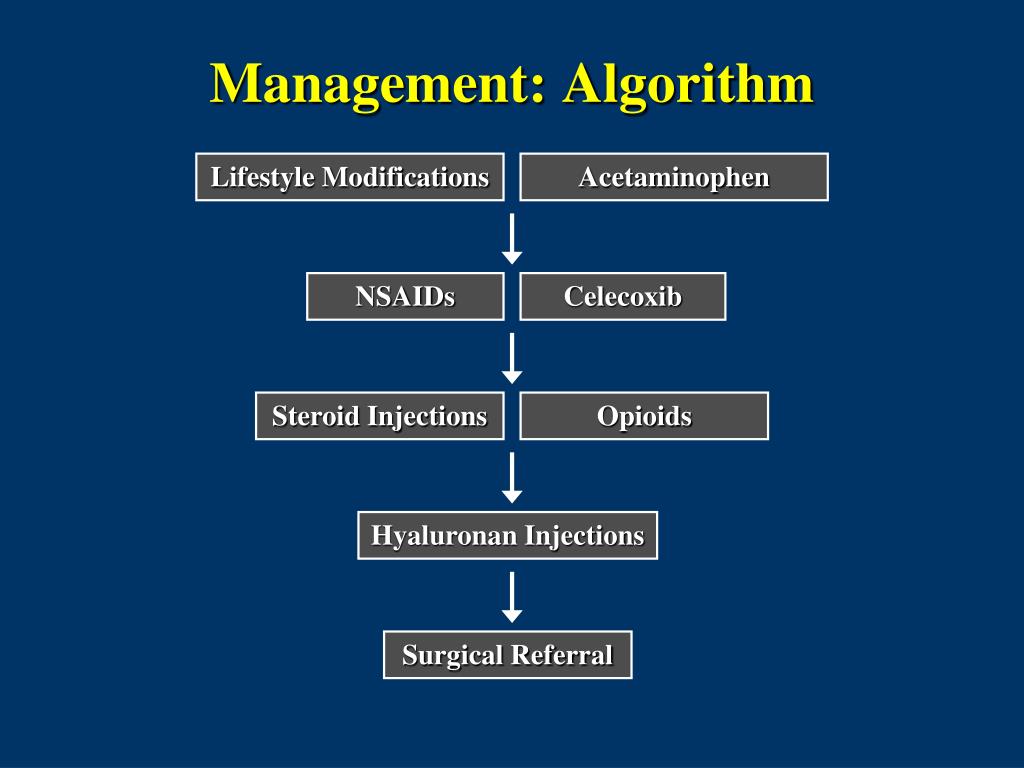 Management: Algorithm Lifestyle Modifications Acetaminophen NSAIDs Celecoxib Steroid Injections Opioids Hyaluronan Injections Surgical Referral