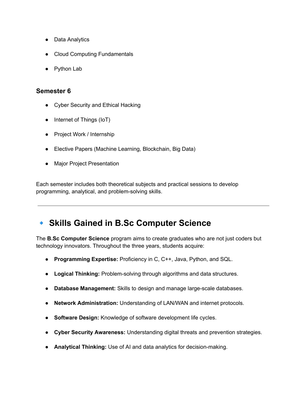 ● Data Analytics ● Cloud Computing Fundamentals ● Python Lab Semester 6 ● Cyber Security and Ethical Hacking ● Internet of Things (IoT) ● Project Work / Internship ● Elective Papers (Machine Learning, Blockchain, Big Data) ● Major Project Presentation Each semester includes both theoretical subjects and practical sessions to develop programming, analytical, and problem-solving skills. ? Skills Gained in B.Sc Computer Science The B.Sc Computer Science program aims to create graduates who are not just coders but technology innovators. Throughout the three years, students acquire: ● Programming Expertise: Proficiency in C, C++, Java, Python, and SQL. ● Logical Thinking: Problem-solving through algorithms and data structures. ● Database Management: Skills to design and manage large-scale databases. ● Network Administration: Understanding of LAN/WAN and internet protocols. ● Software Design: Knowledge of software development life cycles. ● Cyber Security Awareness: Understanding digital threats and prevention strategies. ● Analytical Thinking: Use of AI and data analytics for decision-making.