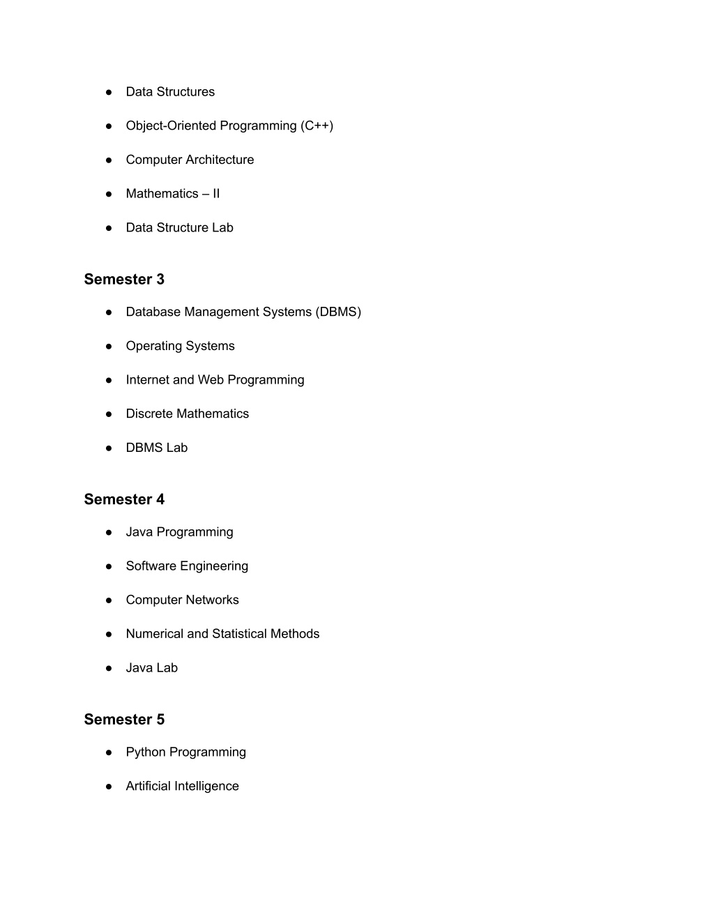● Data Structures ● Object-Oriented Programming (C++) ● Computer Architecture ● Mathematics – II ● Data Structure Lab Semester 3 ● Database Management Systems (DBMS) ● Operating Systems ● Internet and Web Programming ● Discrete Mathematics ● DBMS Lab Semester 4 ● Java Programming ● Software Engineering ● Computer Networks ● Numerical and Statistical Methods ● Java Lab Semester 5 ● Python Programming ● Artificial Intelligence