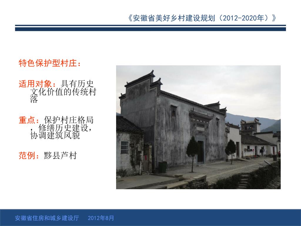 特色保护型村庄: 适用对象:具有历史文化价值的传统村落 重点:保护村庄格局,修缮历史建设,协调建筑风貌 范例:黟县芦村