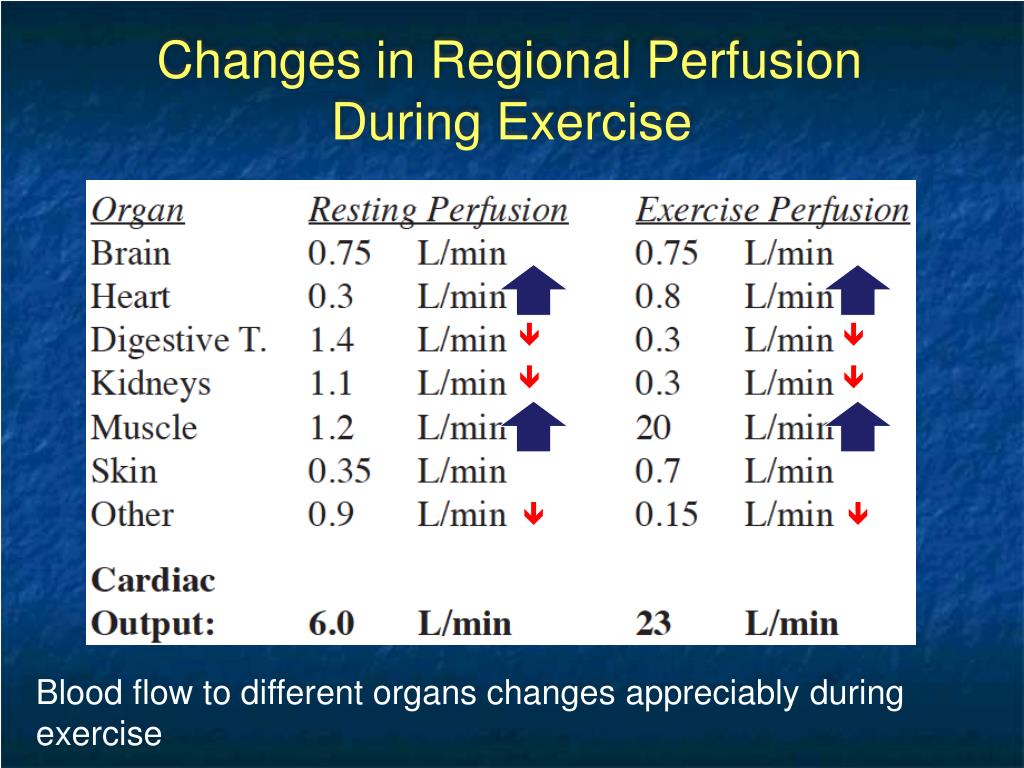 Changes in Regional Perfusion During Exercise Blood flow to different organs changes appreciably during exercise