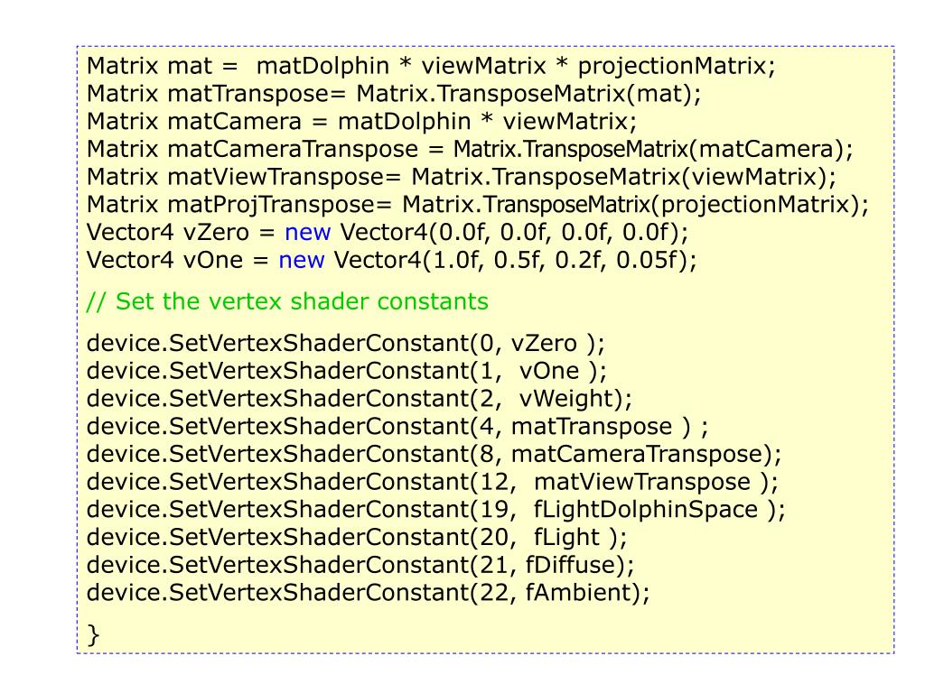 Matrix mat = matDolphin * viewMatrix * projectionMatrix;Matrix matTranspose= Matrix.TransposeMatrix(mat);Matrix matCamera = matDolphin * viewMatrix;Matrix matCameraTranspose = Matrix.TransposeMatrix(matCamera);Matrix matViewTranspose= Matrix.TransposeMatrix(viewMatrix);Matrix matProjTranspose= Matrix.TransposeMatrix(projectionMatrix); Vector4 vZero = new Vector4(0.0f, 0.0f, 0.0f, 0.0f);Vector4 vOne = new Vector4(1.0f, 0.5f, 0.2f, 0.05f); // Set the vertex shader constants device.SetVertexShaderConstant(0, vZero );device.SetVertexShaderConstant(1, vOne );device.SetVertexShaderConstant(2, vWeight);device.SetVertexShaderConstant(4, matTranspose ) ;device.SetVertexShaderConstant(8, matCameraTranspose); device.SetVertexShaderConstant(12, matViewTranspose );device.SetVertexShaderConstant(19, fLightDolphinSpace );device.SetVertexShaderConstant(20, fLight );device.SetVertexShaderConstant(21, fDiffuse);device.SetVertexShaderConstant(22, fAmbient); }