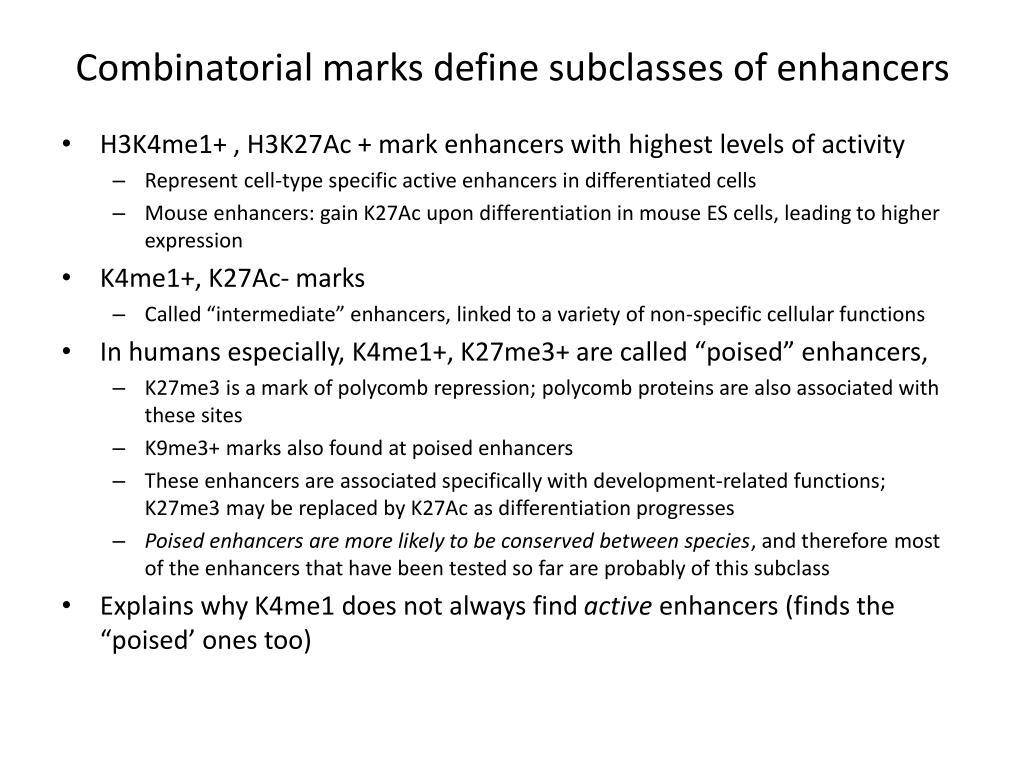 Combinatorial marks define subclasses of enhancers • H3K4me1+ , H3K27Ac + mark enhancers with highest levels of activity • Represent cell-type specific active enhancers in differentiated cells • Mouse enhancers: gain K27Ac upon differentiation in mouse ES cells, leading to higher expression • K4me1+, K27Ac- marks • Called “intermediate” enhancers, linked to a variety of non-specific cellular functions • In humans especially, K4me1+, K27me3+ are called “poised” enhancers, • K27me3 is a mark of polycomb repression; polycomb proteins are also associated with these sites • K9me3+ marks also found at poised enhancers • These enhancers are associated specifically with development-related functions; K27me3 may be replaced by K27Ac as differentiation progresses • Poised enhancers are more likely to be conserved between species, and therefore most of the enhancers that have been tested so far are probably of this subclass • Explains why K4me1 does not always find active enhancers (finds the “poised’ ones too)