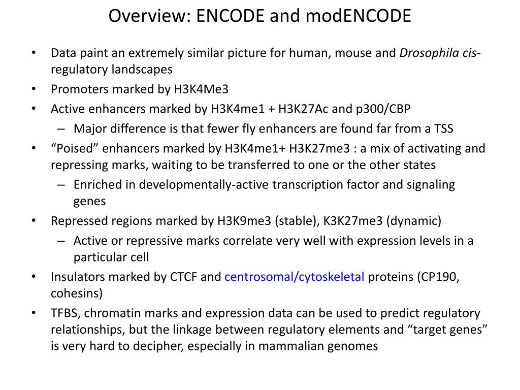 Overview: ENCODE and modENCODE • Data paint an extremely similar picture for human, mouse and Drosophilacis-regulatory landscapes • Promoters marked by H3K4Me3 • Active enhancers marked by H3K4me1 + H3K27Ac and p300/CBP • Major difference is that fewer fly enhancers are found far from a TSS • “Poised” enhancers marked by H3K4me1+ H3K27me3 : a mix of activating and repressing marks, waiting to be transferred to one or the other states • Enriched in developmentally-active transcription factor and signaling genes • Repressed regions marked by H3K9me3 (stable), K3K27me3 (dynamic) • Active or repressive marks correlate very well with expression levels in a particular cell • Insulators marked by CTCF and centrosomal/cytoskeletalproteins (CP190, cohesins) • TFBS, chromatin marks and expression data can be used to predict regulatory relationships, but the linkage between regulatory elements and “target genes” is very hard to decipher, especially in mammalian genomes