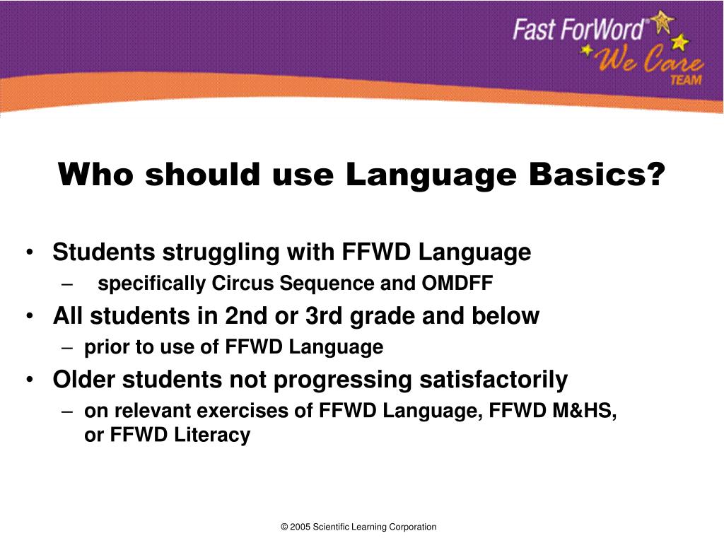 Who should use Language Basics? • Students struggling with FFWD Language • specifically Circus Sequence and OMDFF • All students in 2nd or 3rd grade and below • prior to use of FFWD Language • Older students not progressing satisfactorily • on relevant exercises of FFWD Language, FFWD M&HS,or FFWD Literacy © 2005 Scientific Learning Corporation