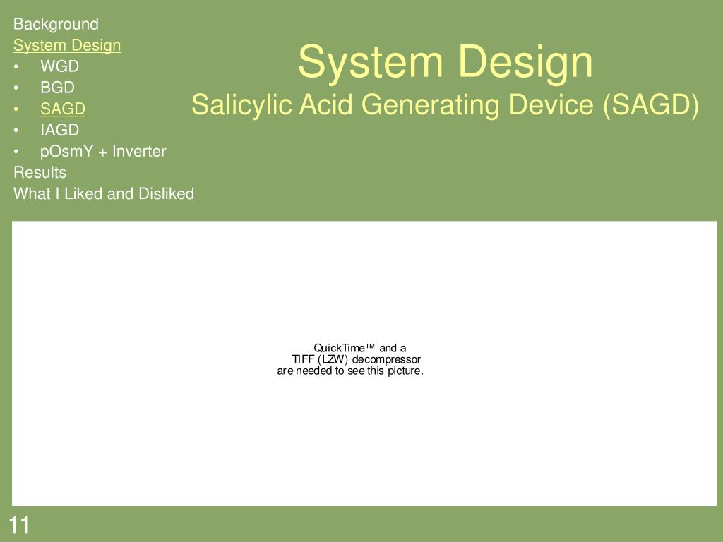 Background System Design • WGD • BGD • SAGD • IAGD • pOsmY + Inverter Results What I Liked and Disliked System DesignSalicylic Acid Generating Device (SAGD) 11