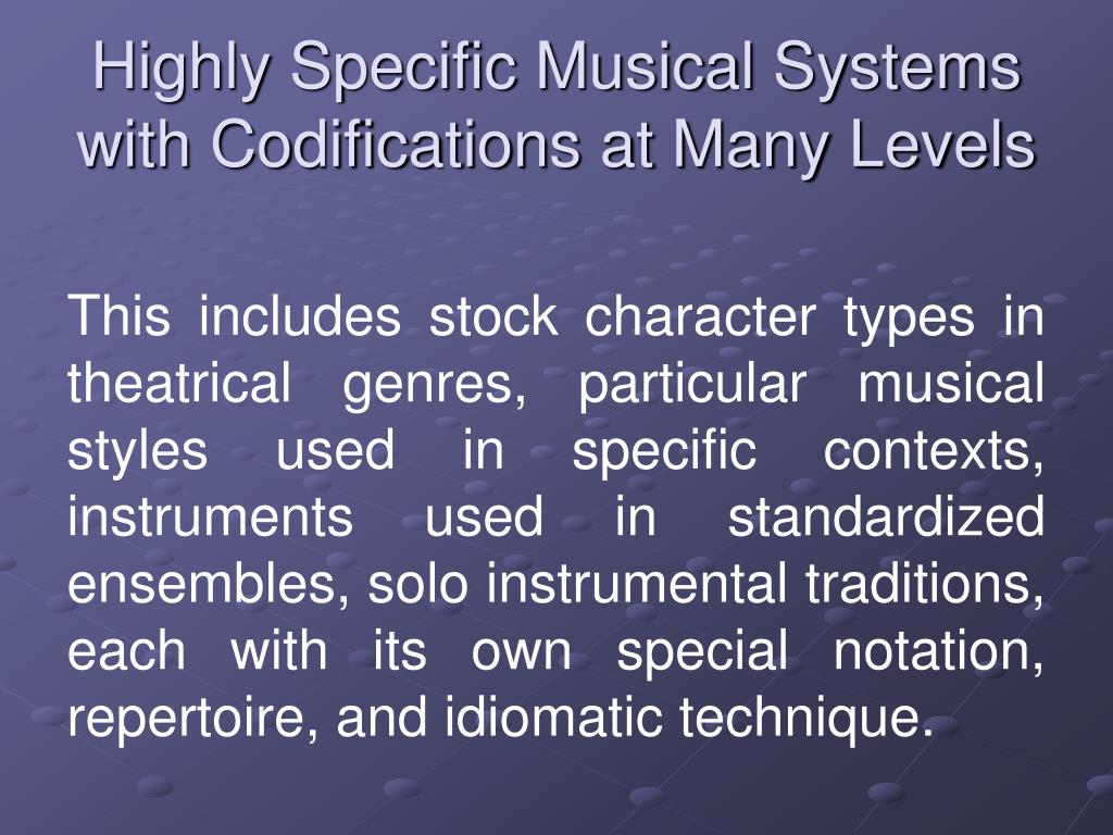 Highly Specific Musical Systems with Codifications at Many Levels This includes stock character types in theatrical genres, particular musical styles used in specific contexts, instruments used in standardized ensembles, solo instrumental traditions, each with its own special notation, repertoire, and idiomatic technique.
